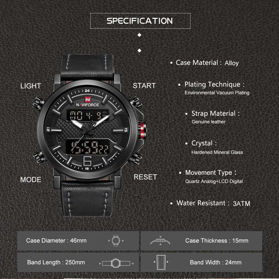 NAVIFORCE мужские спортивные часы мужские кварцевые светодиодные цифровые часы Топ бренд класса люкс мужские модные кожаные водонепроницаемые военные наручные часы