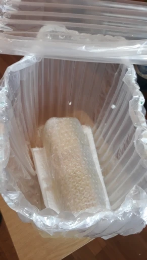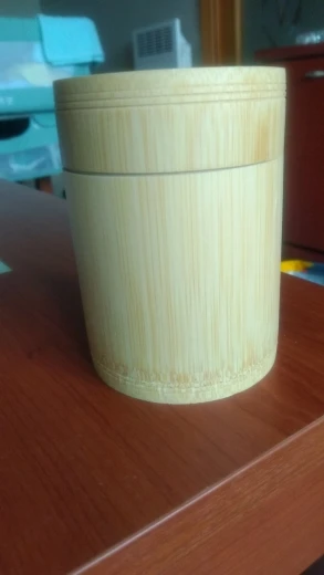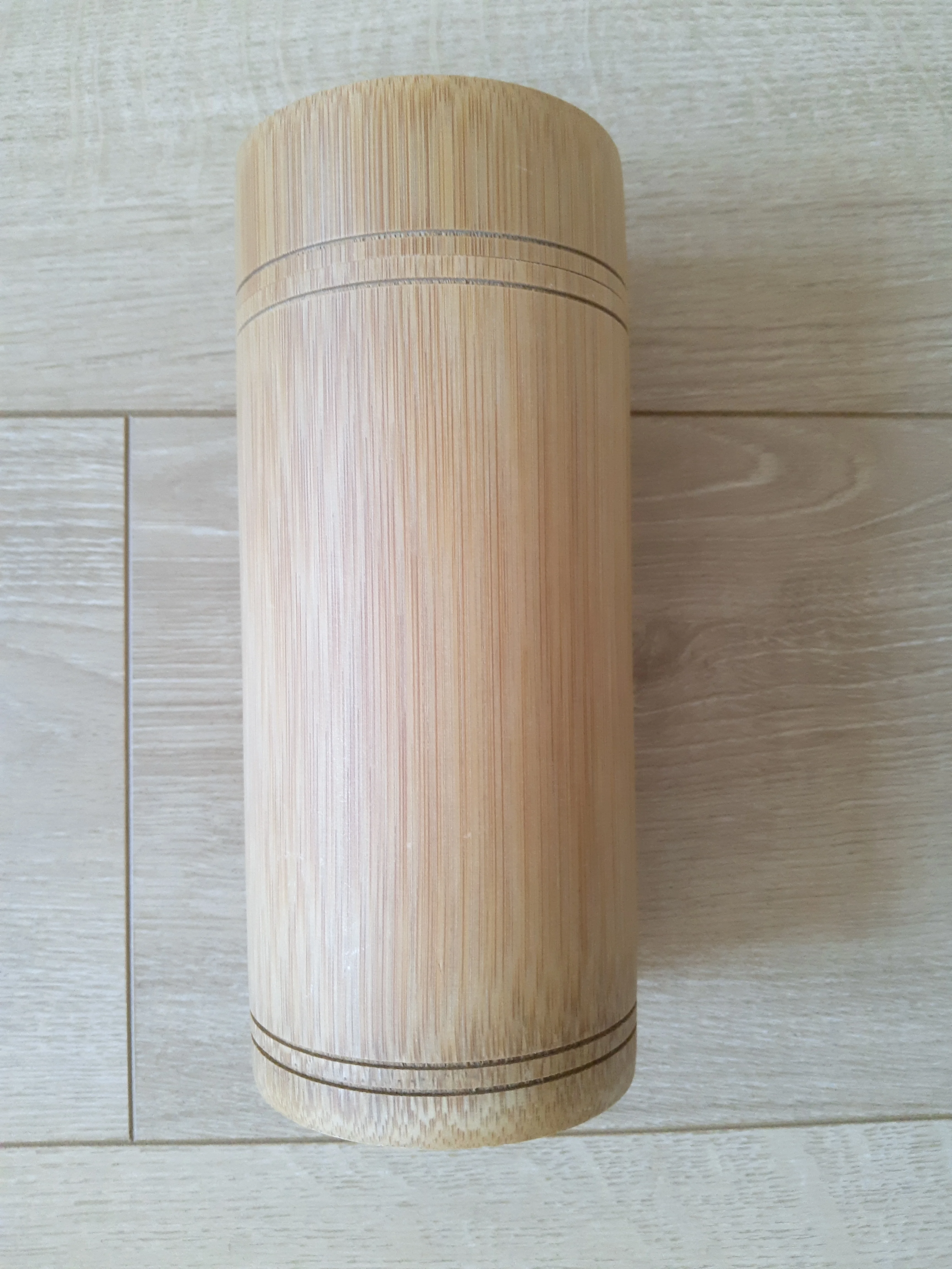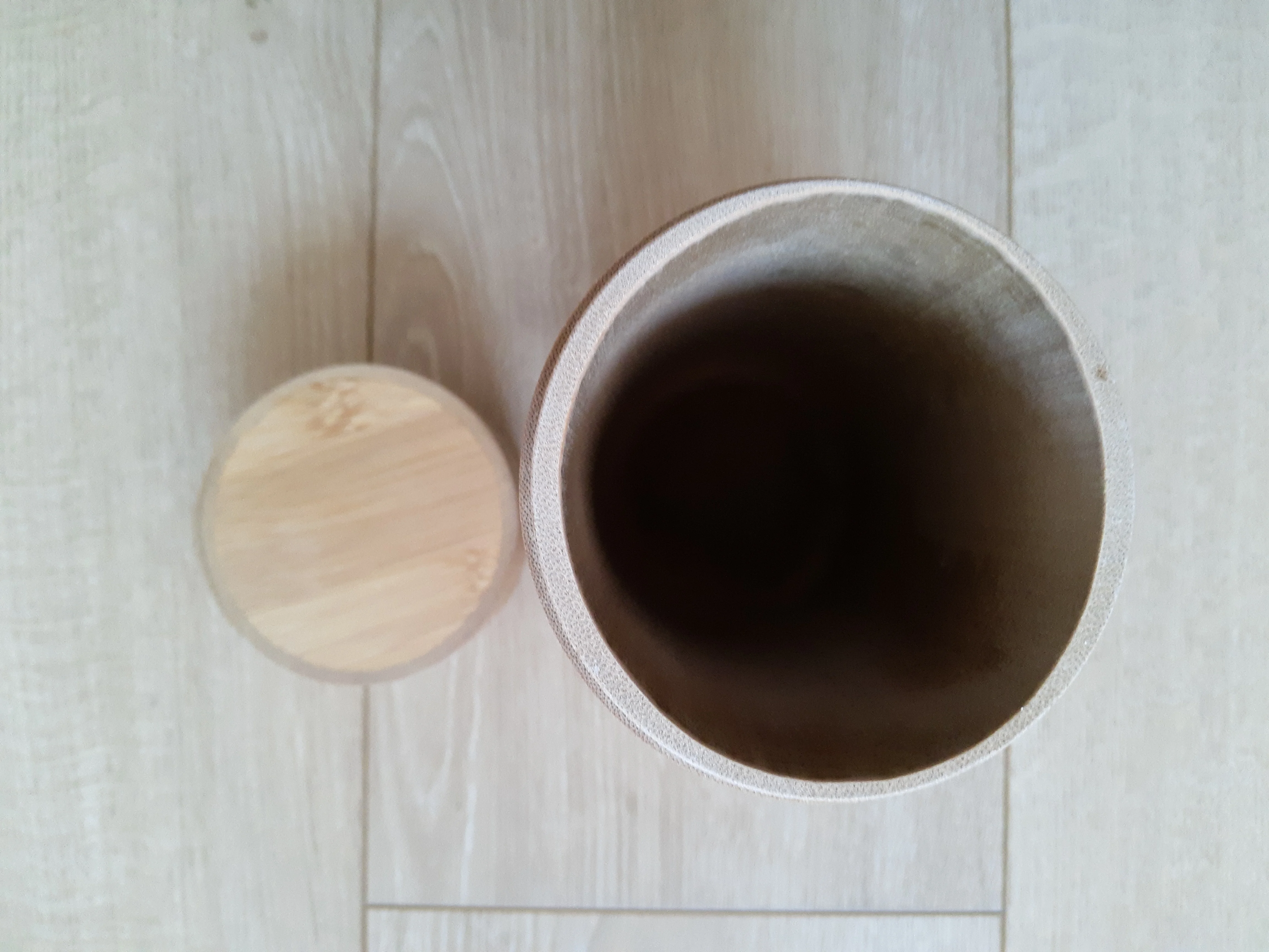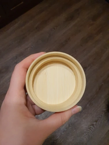 Баночка интересная. Упакована была со всей силы: пупыка, слой воздушных крупных пузырей, пупырка, соответственно, приехала целой и быстро в объединении с другими посылками. Исходно закрывается плотно. Пришла немного пыльная после изготовления. Дальше мой промах: я её ополоснула, и её ожидаемо повело - дерево, хоть и бамбук, придётся немного подточить, чтобы закрывалась снова))