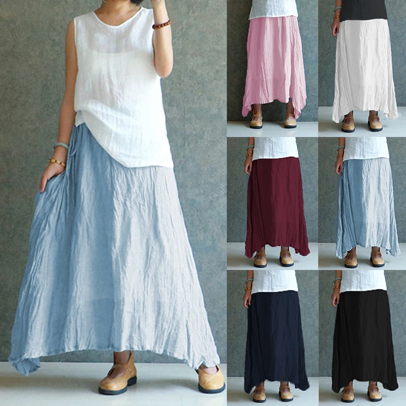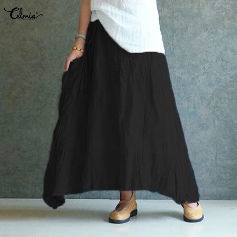 Женские Винтажные льняные юбки Celmia, повседневные свободные однотонные длинные юбки с эластичным поясом, пляжные плиссированные макси-юбки размера плюс, лето 2020