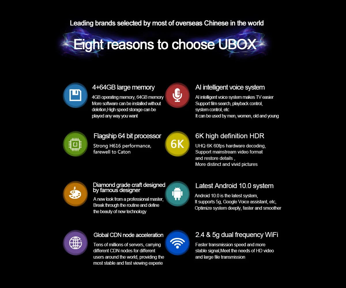 Питание от Android 10,0 для превосходной функциональностиUbox9 питается от Android 10,0, прост в использовании и поддерживает голосовой поискИ Chromecast, а также обеспечивает мир контента, которым может наслаждаться вся семья