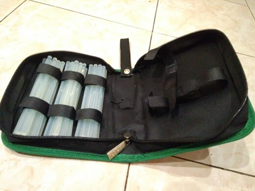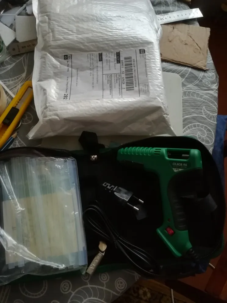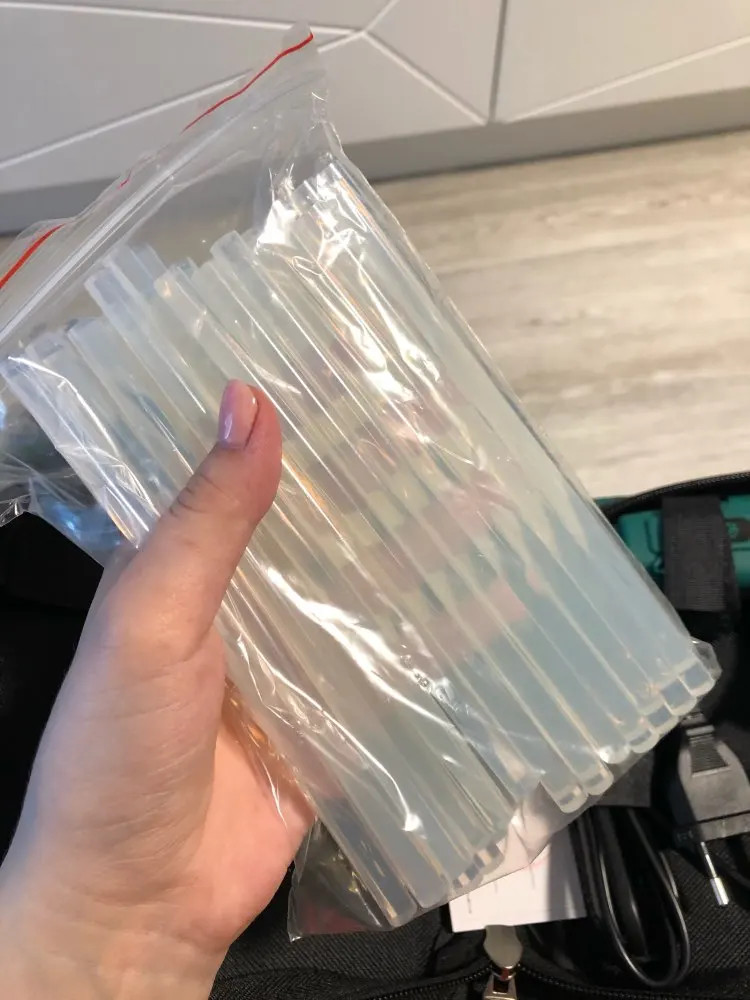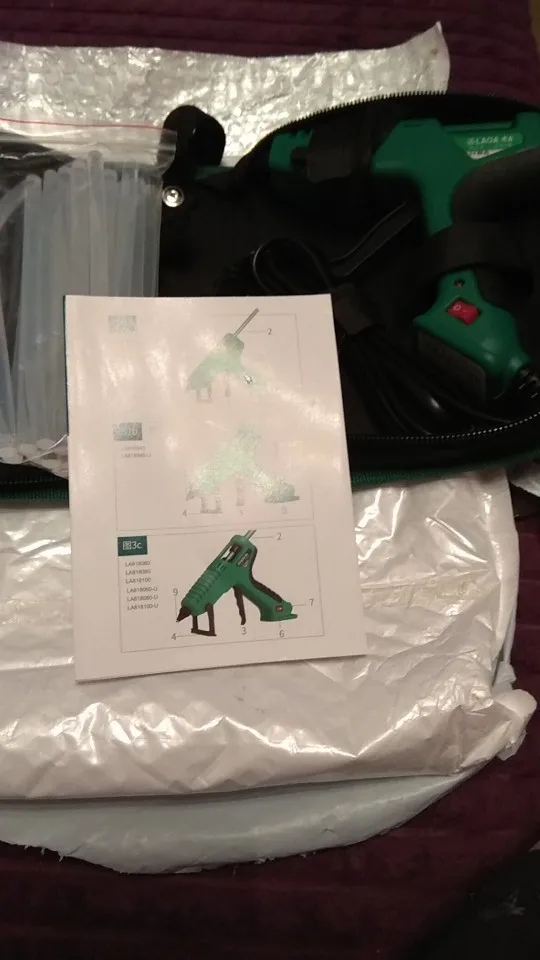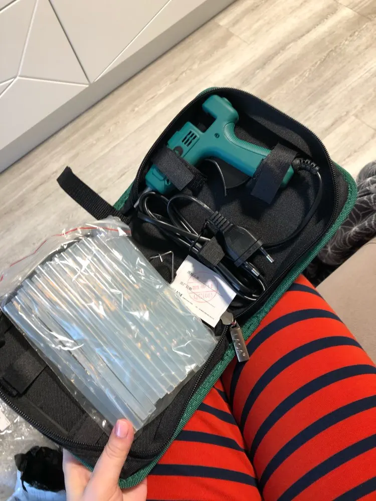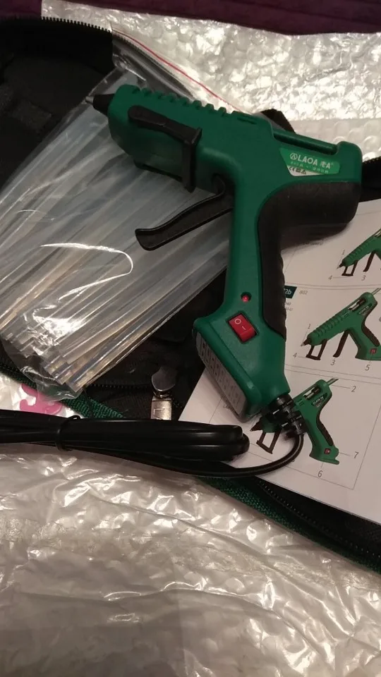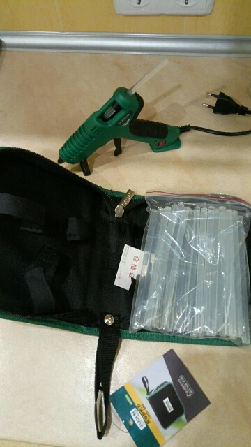 Посылку ждал около месяца. Упаковка довольно хлипкая и я удивлен , что все целым пришло. Сумка , что идет в комплекте по мне так маловата для всего набора и из-за этого сильно гнется кабель питания. Сам " пистолет " довольно маленького размера , чисто для домашних нужд . Мощности 40w хватает , чтобы разогреть клей где то за 3-5 минут. С кончика не капает когда пистолет стоит на подставке. Цена как по мне завышена ( брал за 1147 руб). Можно и дешевле найти.