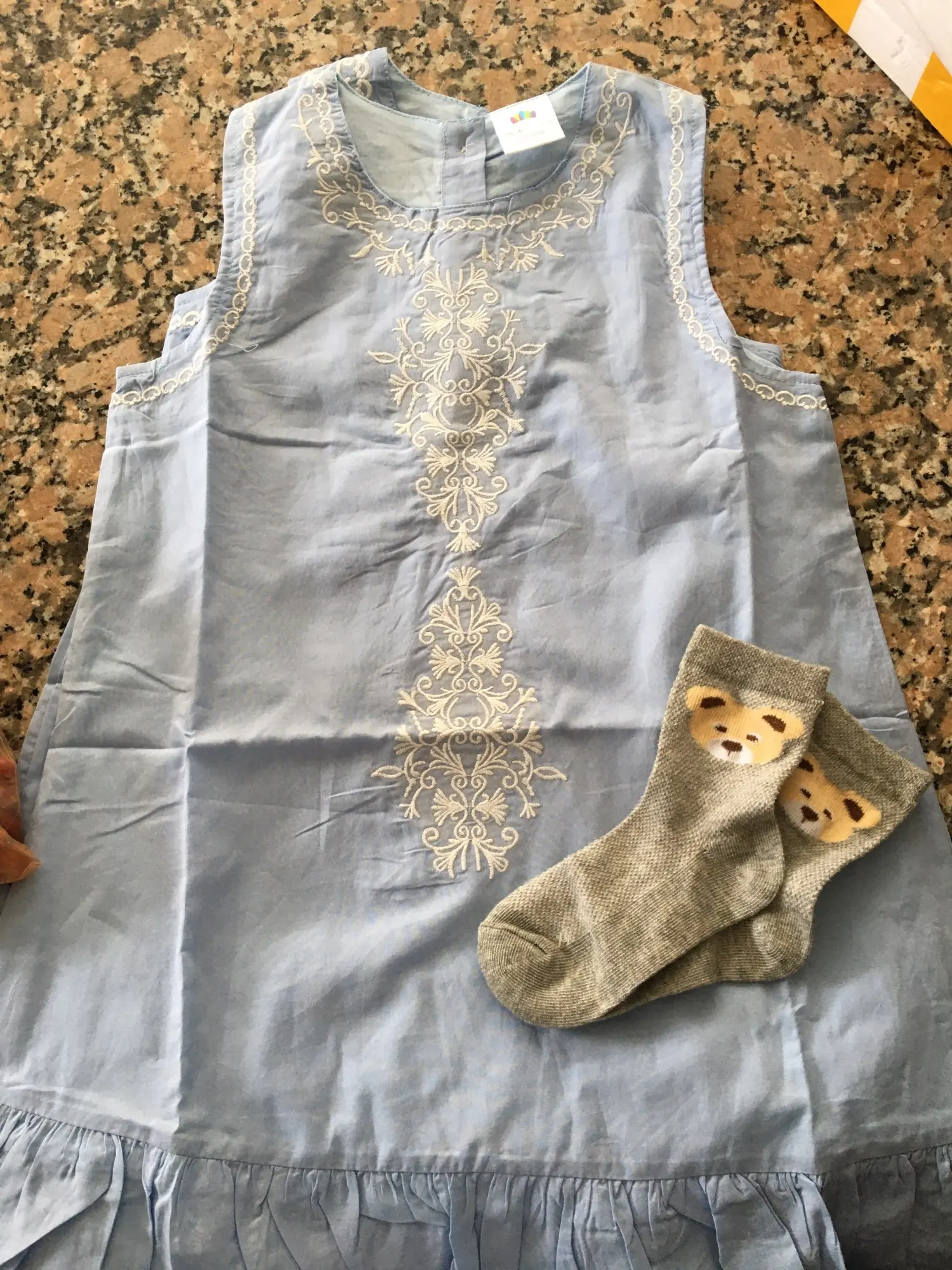 Так же, как фотографии. Моей дочери шесть лет, и я заказал размер 8, и она ей подходит. Хотя это выше, чем обычно. Ткань немного тонкая, но на лето она хороша для прохладного. Это выглядит красиво.