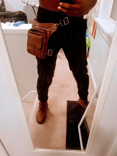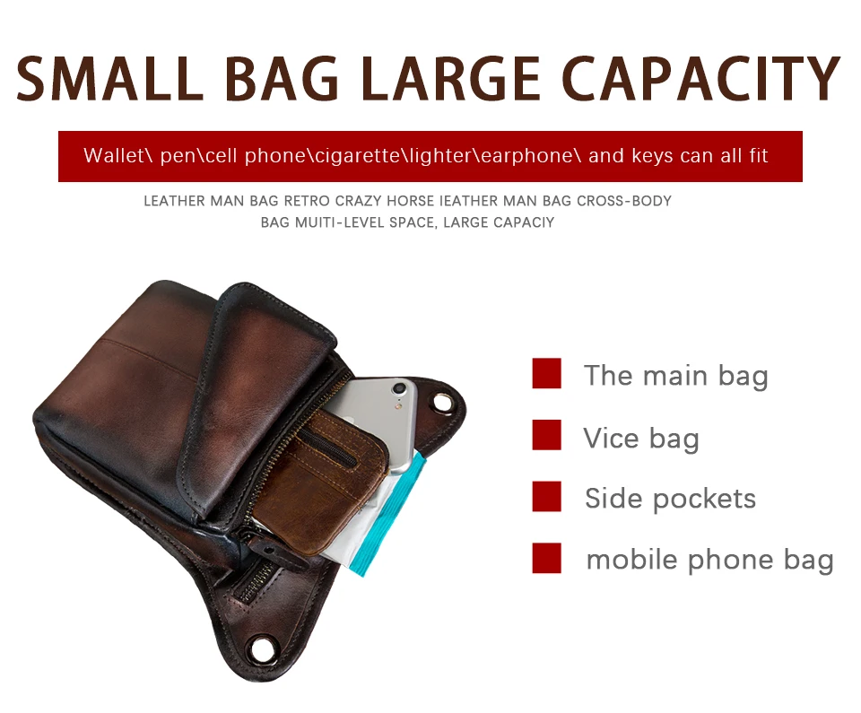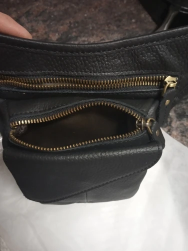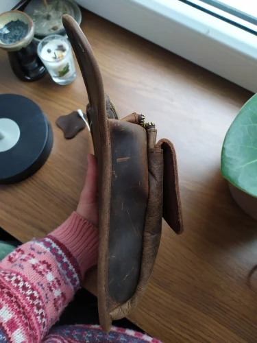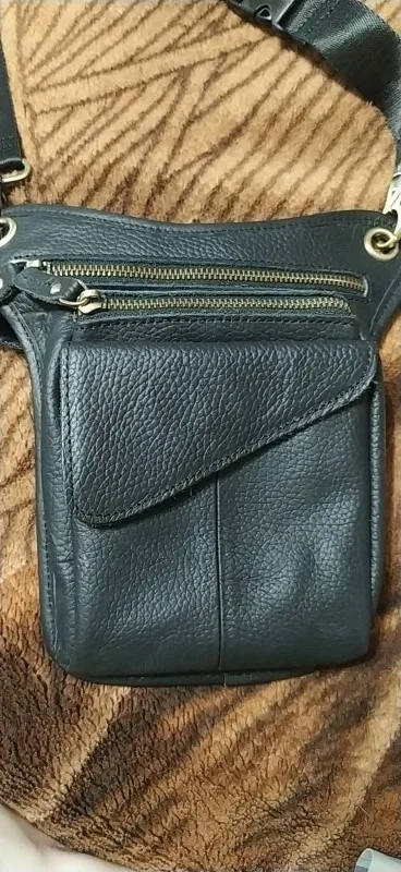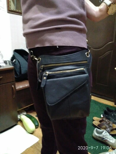 Сумочка супер, толстая кожа, натуральная, пахнет сапогами. Внутри лежат ремешки для пояса и бедра, единственное, не все телефоны комфортно помещаются, мой redmi note 7 спокойно залез в верхний отдел, а у мужа note 9, уже с трудом, хотя если чехол снять, может и поместится.