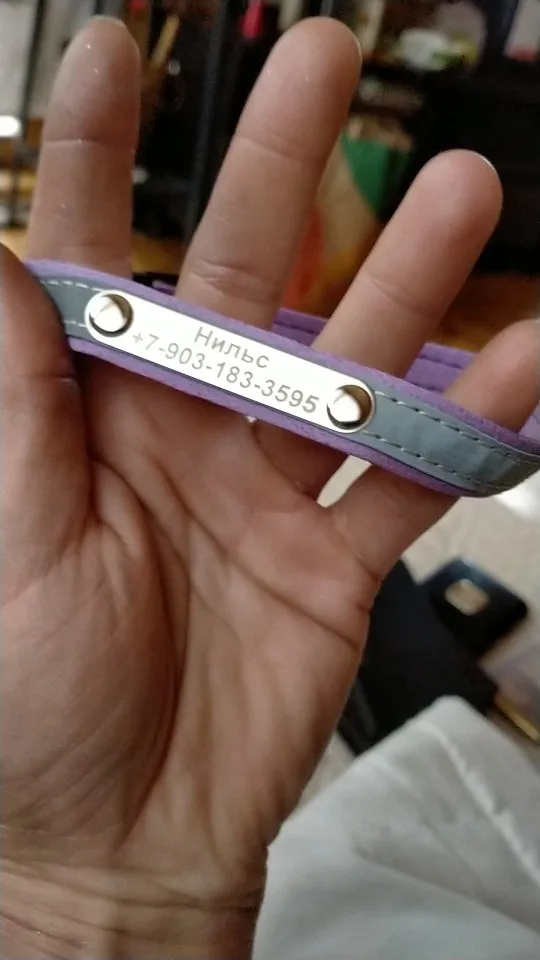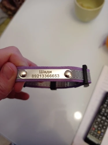 Ошейник пришёл быстро! Написал в личном сообщении продавцу кличку котёнка и номер телефона, гравировку сделали четко! Рекомендую! Но мне кажется, что больше подойдёт для небольших собак/щенят, для нашей кошки мне показался великоват, но может с непривычки... И ещё на ремешке светоотражающая лента! В общем класс!