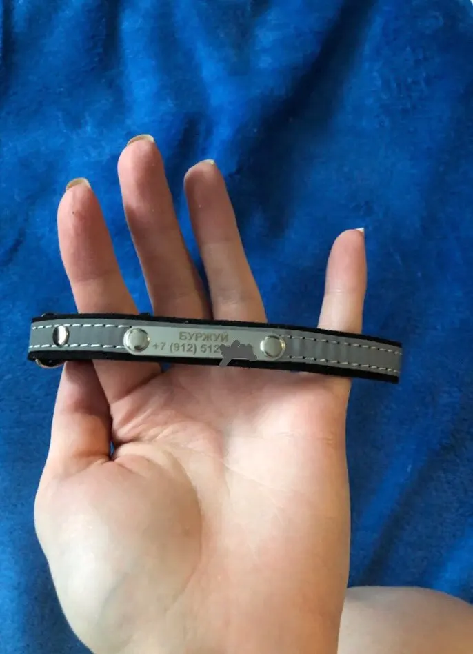 очень хороший ошейник. На ошейнике написано имя питомца и телефон (указывал при заказе) - очень удобно! спасибо за хороший товар