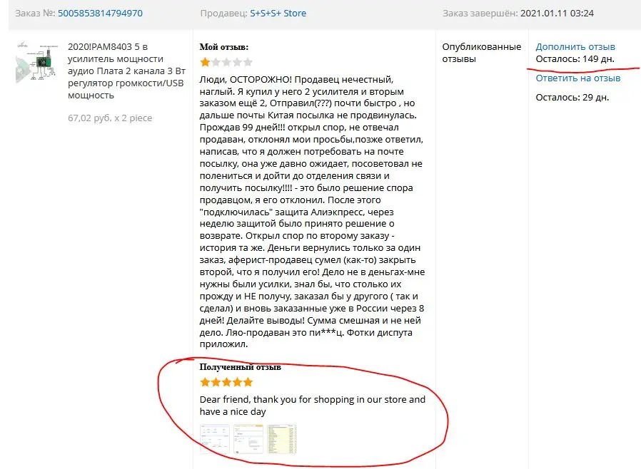 Люди, ОСТОРОЖНО!. Продавец нечестный, наглый. Я купил у него 2 усилителя и вторым заказом ещё 2, Отправил(???) почти быстро , но дальше почты Китая посылка не продвинулась. Прождав 99 дней!!! открыл спор, не отвечал продаван, отклонял мои просьбы,позже ответил, что я должен потребовать на почте посылку, она уже давно ожидает, посоветовал не полениться и дойти до отделения связи, получить посылку!!!! - это было решение спора продавцом, я его отклонил. После этого "подключилась" защита Алиэкпресс, через неделю защитой было принято решение о возврате. Открыл спор по второму заказу - история та же. Деньги вернулись только за один заказ, АФЕРИСТ-продавец сумел (как-то?) закрыть второй, что я получил его! Дело не в деньгах-мне нужны были усилки, знал бы, что столько их прожду и НЕ получу, заказал бы у другого ( так и сделал) и вновь заказанные уже в России через 8 дней! Делайте выводы! Сумма смешная и не ней дело. Ляо-продаван это пи***ц. Фотки диспута приложил. На ЛЮБОЙ отзыв робот отвечает