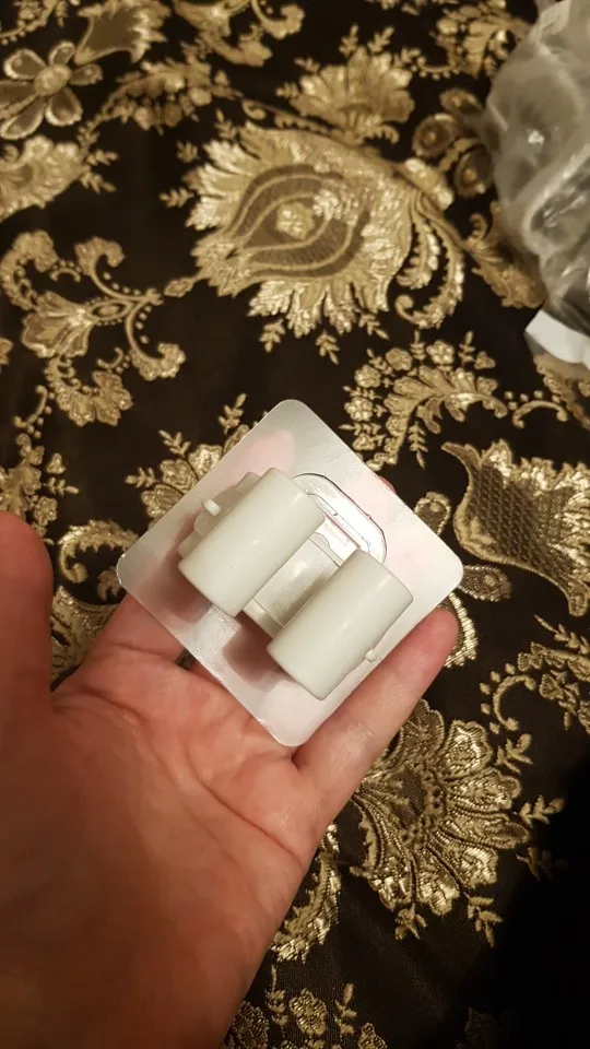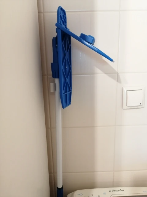 Очень удобное приспособление, на стену клеится на липкую основу. Само место для ручки швабры держится за счет силиконовой вставки, которая может растянутся от маленького до большого размера.