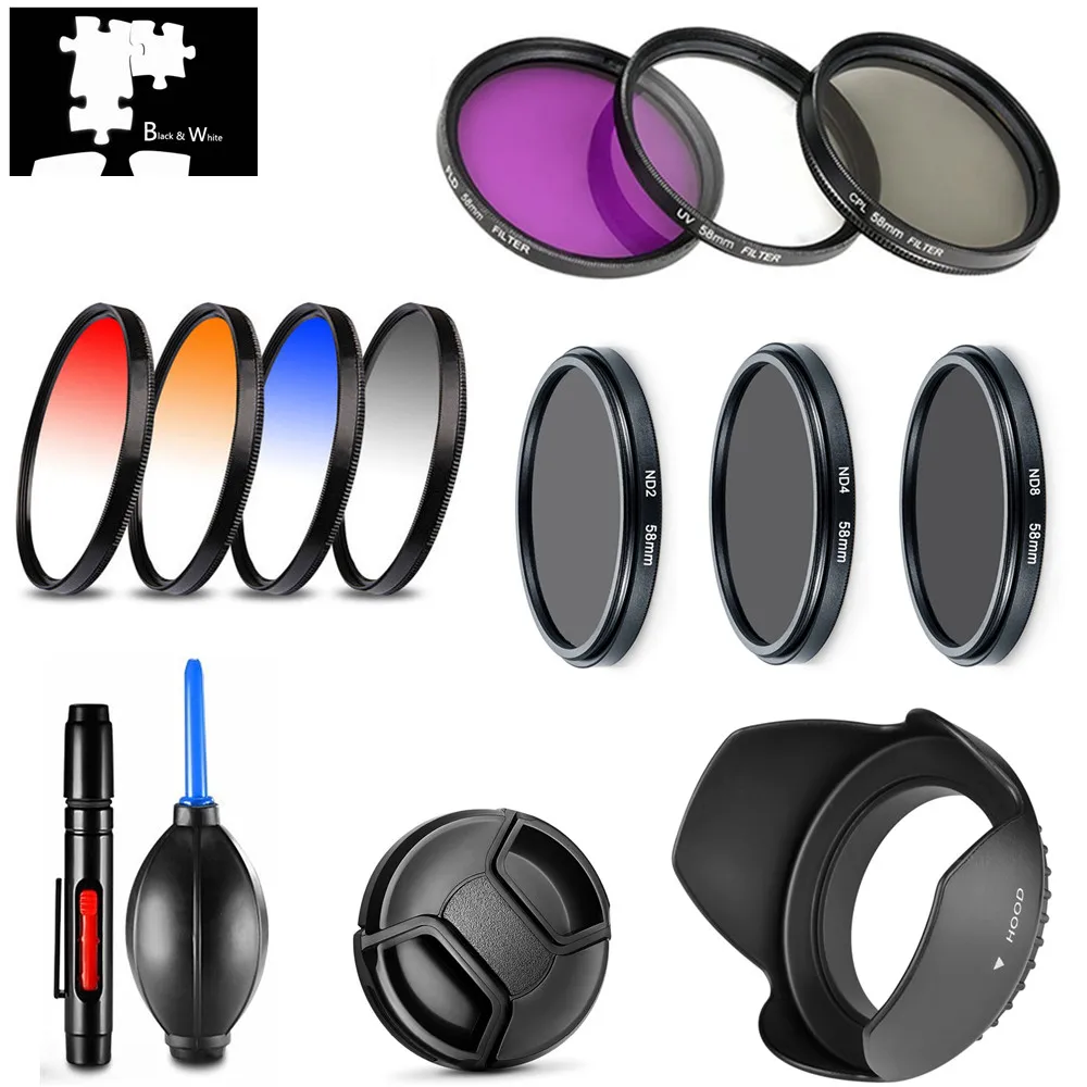 Бленда объектива для уменьшения солнечного света Крышка объектива для защиты Чистящая ручка для острых линз УФ-фильтр для поглощения ультрафиолетового света CPL (круговой поляризатор) для удаления воды или стекла или световых отражений FLD (цветовое освещение дневного света) для съемки под флуоресцентным освещением и теплого вашего фото ND2/ND4/ND8 (нейтральная плотность) для захвата движения с медленными скоростями затвора Star 4 6 8 лучей дляПреобразует яркость солнца, мигает свет на воде, отражения и т. Д. В культурно читаемое изображение. Может использоваться в комбинации с другими фильтрами для необычайно творческих эффектов Градиентные цветные фильтры обеспечивают постепенный переход цвета для плавного эффекта смешивания. Придайте вашему ландшафту и текстуре кожи более красочное прикосновение. Идеально подходит для изменения настроения изображения, каждый из фильтров имеет цветную половину, которая добавляет цвет к части изображения, в то время как четкая половина поддерживает нейтральный цветовой баланс. Они особенно полезны для добавления драматических и творческих эффектов в небеса и другие яркие регионы, сохраняя при этом более реалистичные результаты в другой половине кадра. Каждый из фильтров изготовлен из оптического стекла и устанавливается в вращающихся алюминиевых кольцах фильтров для контроля размещения цвета на раме. Кольца фильтров также имеют передние нитки для крепления крышки объектива или укладки дополнительных фильтров для дальнейшего творческого эффекта.