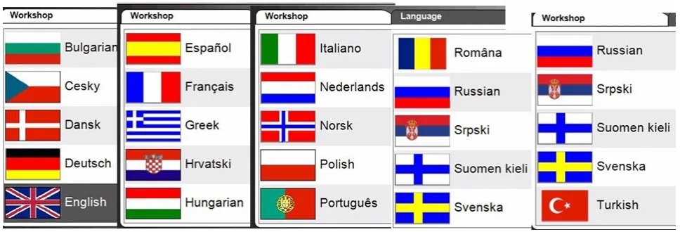 Болгарский, хорватский, чешский, датский, голландский, английский, эстонский, финский, французский, немецкий, греческий, венгерский, итальянский, латышский, литовский, норвежский, польский, португальский, румынский, русский, сербиен, испанский, шведский, турецкий