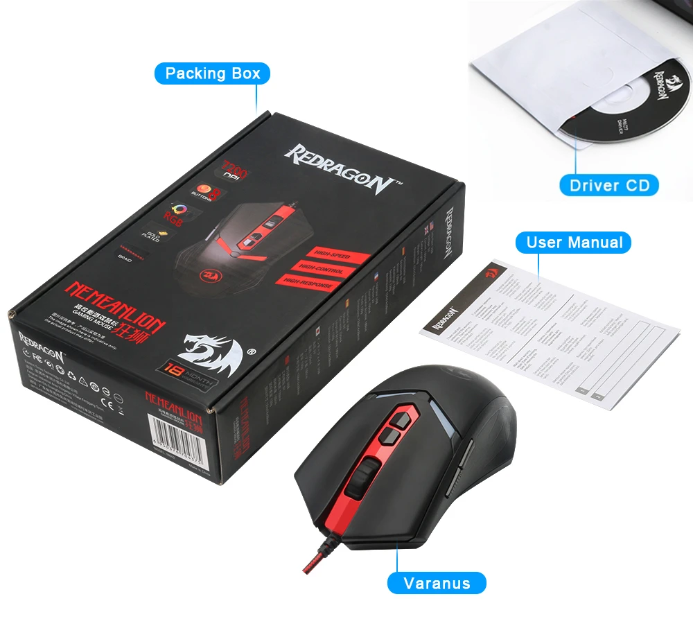 *7 оптимизированных программируемых кнопок (всего 8 кнопок) *Противоскользящее тактильное колесо прокрутки *До 7200 DPI (800/1200/1600/2400/7200 DPI пользовательский регулируемый) *7 цветовых режимов RGB, световые и дыхательные эффекты *Цветной индикатор DPI *Ускорение 10 г *Прочные тефлоновые подушечки для гладких и точных движений *6 футов, 3 мм высокоскоростной Плетеный волоконный кабель и с магнитным фильтром для уменьшения электромагнитных помех *Позолоченный usb-разъем без коррозии для надежного подключения *Размеры изделия 5.x3.2x1.65in, вес изделия: 9,86 унций *Системные требования ПК с usb-портом Windows 10, Windows 8, Windows 7, Windows Vista и Windows XP* Поддержка Plug & Play plus Дополнительная загрузка программного обеспечения, доступна по адресу http://redragonusa.com/downloads