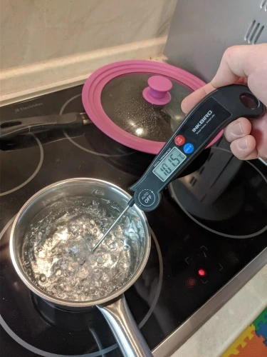 В кипящей воде из фильтра с обратным осмосом погрешность +1 градус, за такую цену могло быть лучше. Качество изготовления очень хорошее, даже батарейка в комплекте.
