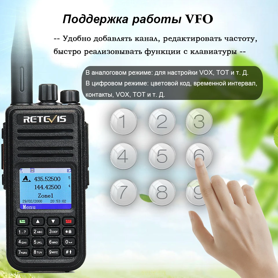 заказ доставлен очень быстро, но пользоваться рацией нужно или в цифре или в аналого режиме, рация заточена на работу с каналами,а с частотами, переключать не удобно, крутить настройки \ вбивать настройки через меню легко не выйдет, очень много вещей делается через настройку на пк, что очень не удобно в полях \ не за пк качество в цифре оценить нормально не вышло, просто понятно что работает как то. модель рации не очень рекомендовал, хотя вроде все как бы красиво,