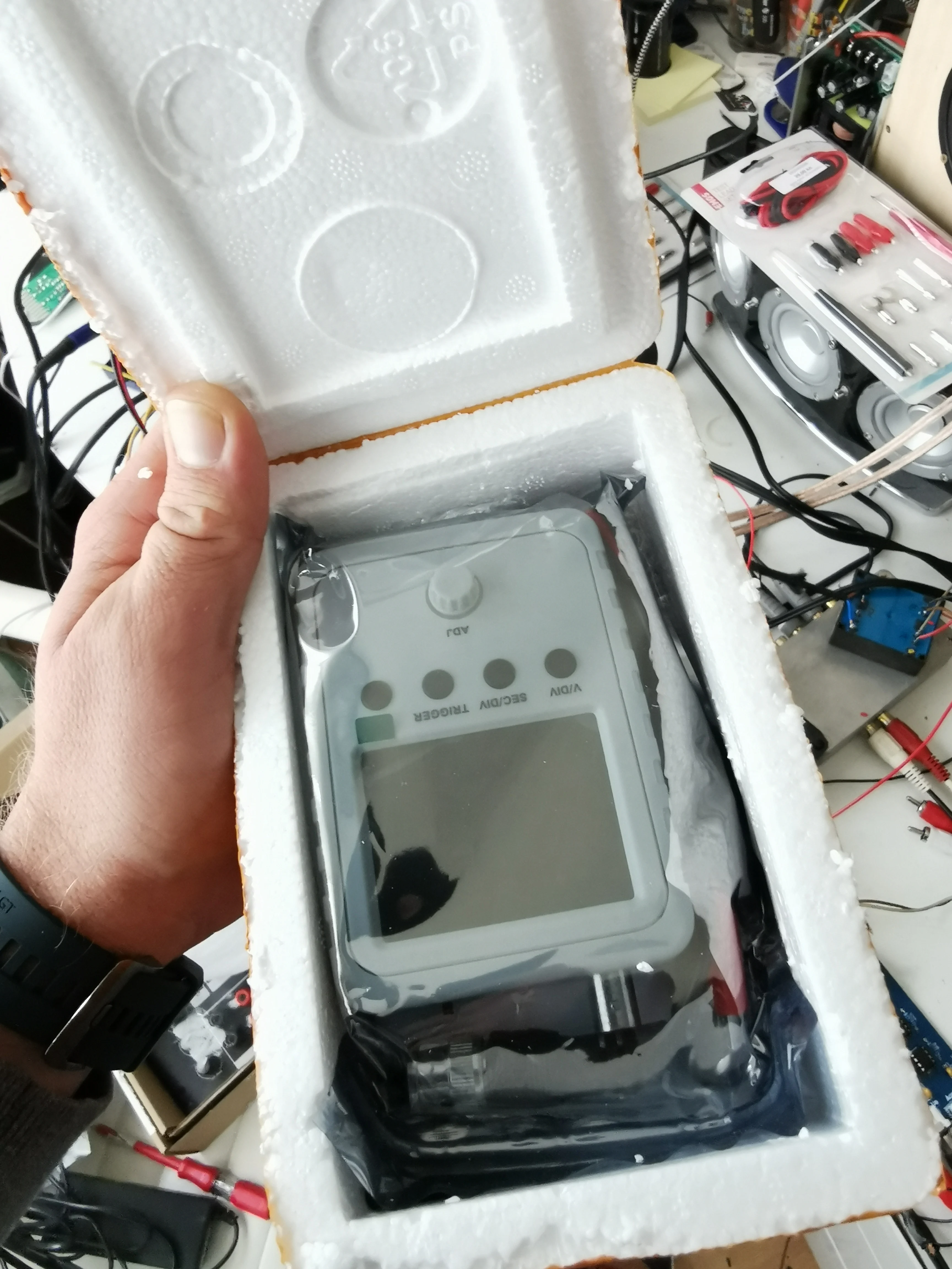 Доставили за 3 недели. Сам осциллограф имеет некоторые косяки: периодически зависает. Может мне попался крива спаяный экземпляр, может где косяк в железе. А так, вроде нормальная игрушка.
