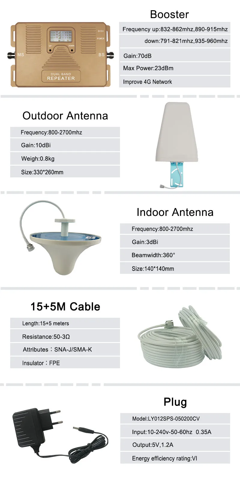 1. LTE 800 + GSM 900 МГц двухдиапазонный ретранслятор 2. Наружная антенна 3. Внутренняя антенна 4. Кабель 20 + 5 метров 5. Мощность штепсельной вилки
