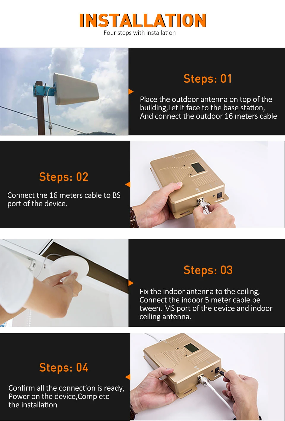1. Пожалуйста, подтвердите частоту вашего мобильного телефона, прежде чем разместить заказ, если вы не знаете, как проверить, вы можете позвонить своему оператору на мобильный телефон. Частота не совпадает, усилитель сигнала не работает. 2. Пожалуйста, убедитесь, что вы можете получить по крайней мере 2 бар 2G/4G сигнал на открытом воздухе перед покупкой, в противном случае этот продукт не может вам помочь. Для улучшения сигнала в помещении необходим хороший внешний сигнал.