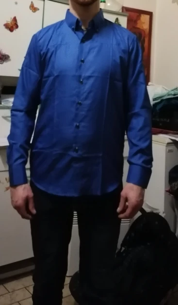 Очень быстрая доставка спасибо! К сожалению, синий цвет отличается от изображения. Более дешевая версия по сравнению с фотографией. Все еще красивая рубашка за эти деньги.