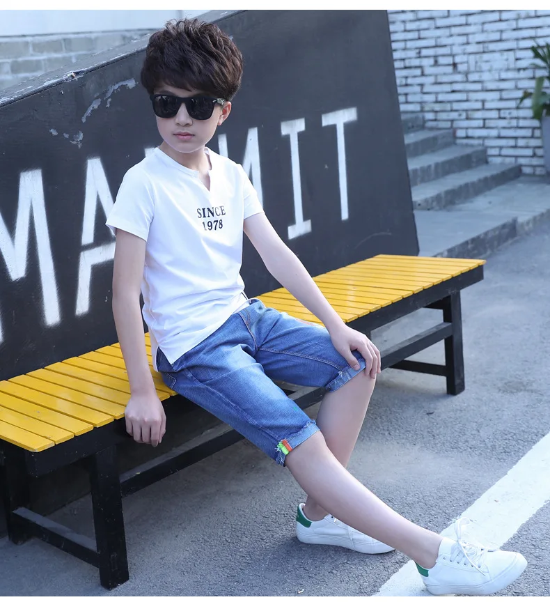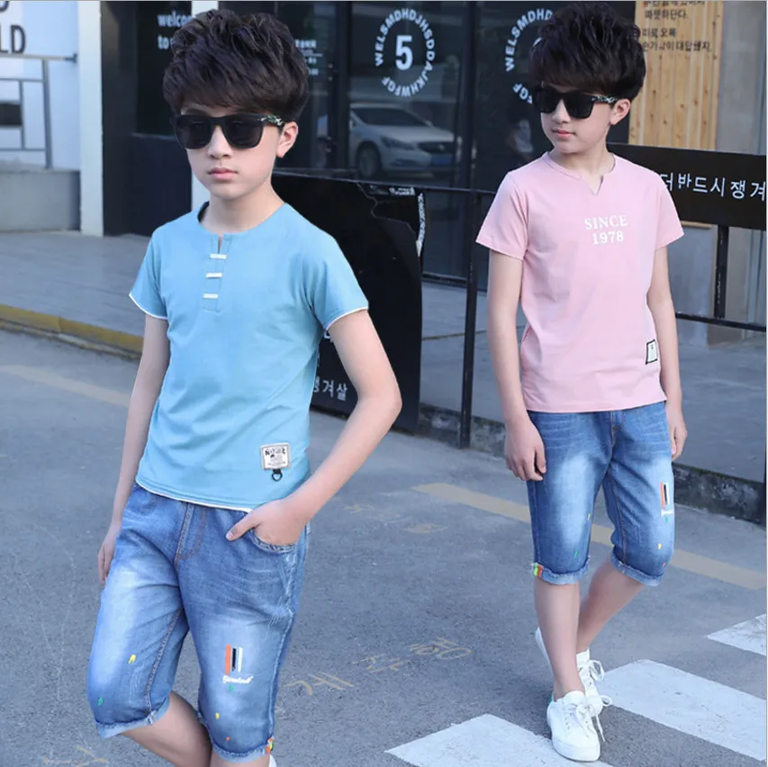 Спортивный костюм для мальчиков, летний модный повседневный комплект из футболки с коротким рукавом и джинсов, От 5 до 14 лет, 2021