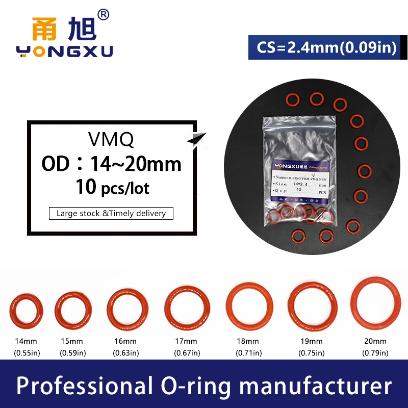 Уплотнительное кольцо VMQ, 20 шт., толщина CS2.4mm, OD14151617181920*2,4 мм, силиконовая резина, водонепроницаемая шайба, нетоксичный, красный