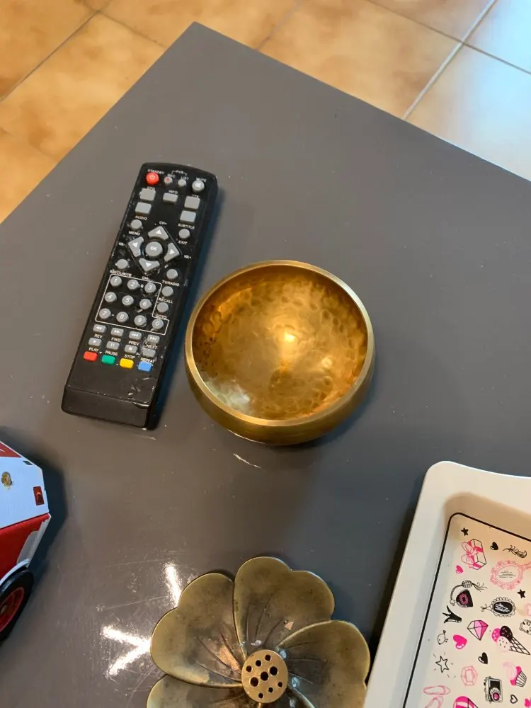 Моя первая звуковая чаша! В комплект входит красная вещь на картинке, на которой чаша сидит. Я надеюсь, это то, что должно быть использовано для ха-ха. Это выглядит великолепно! Раньше я никогда не пользовался им, но я смог довольно быстро разобраться, как сохранить звук так долго, как мне нужно.