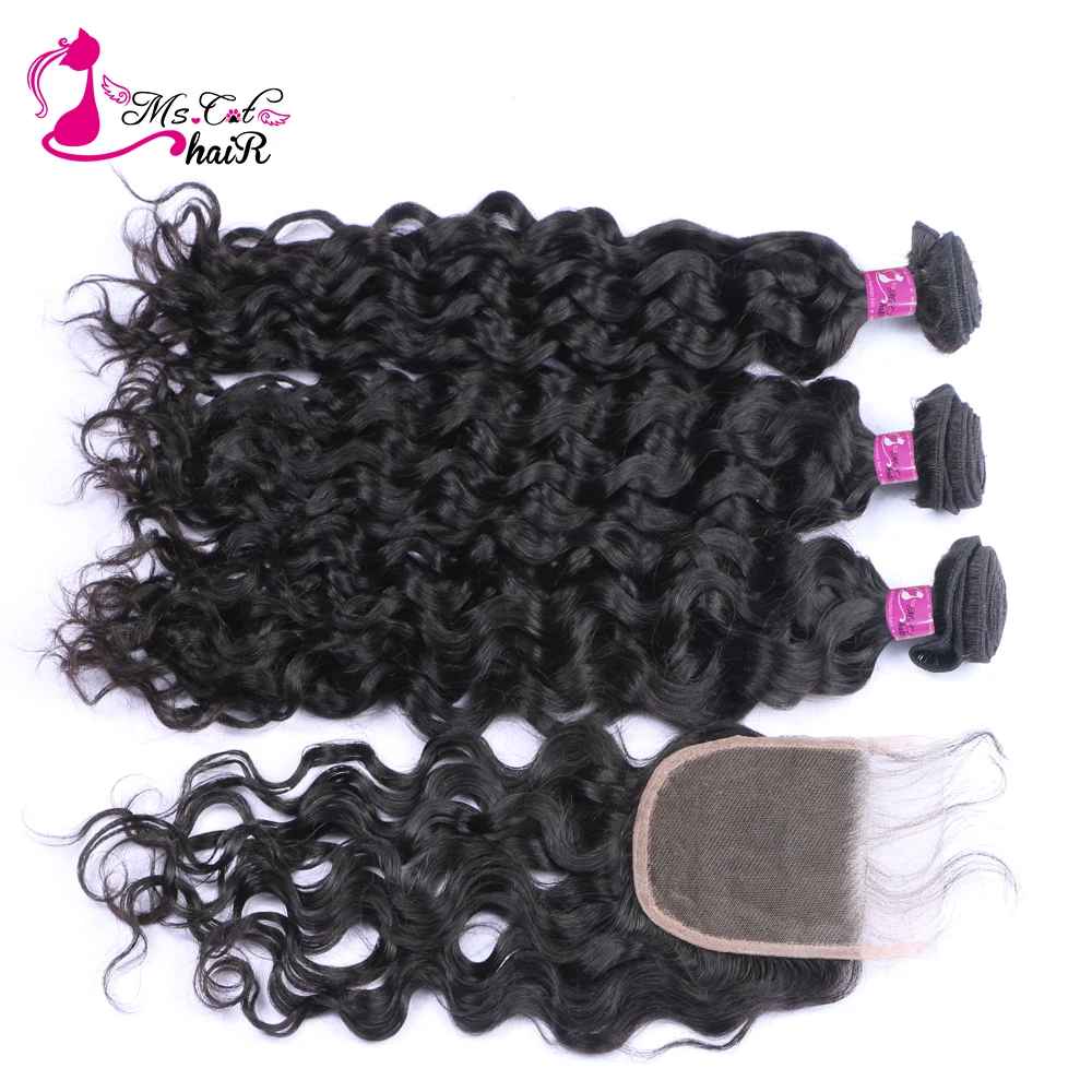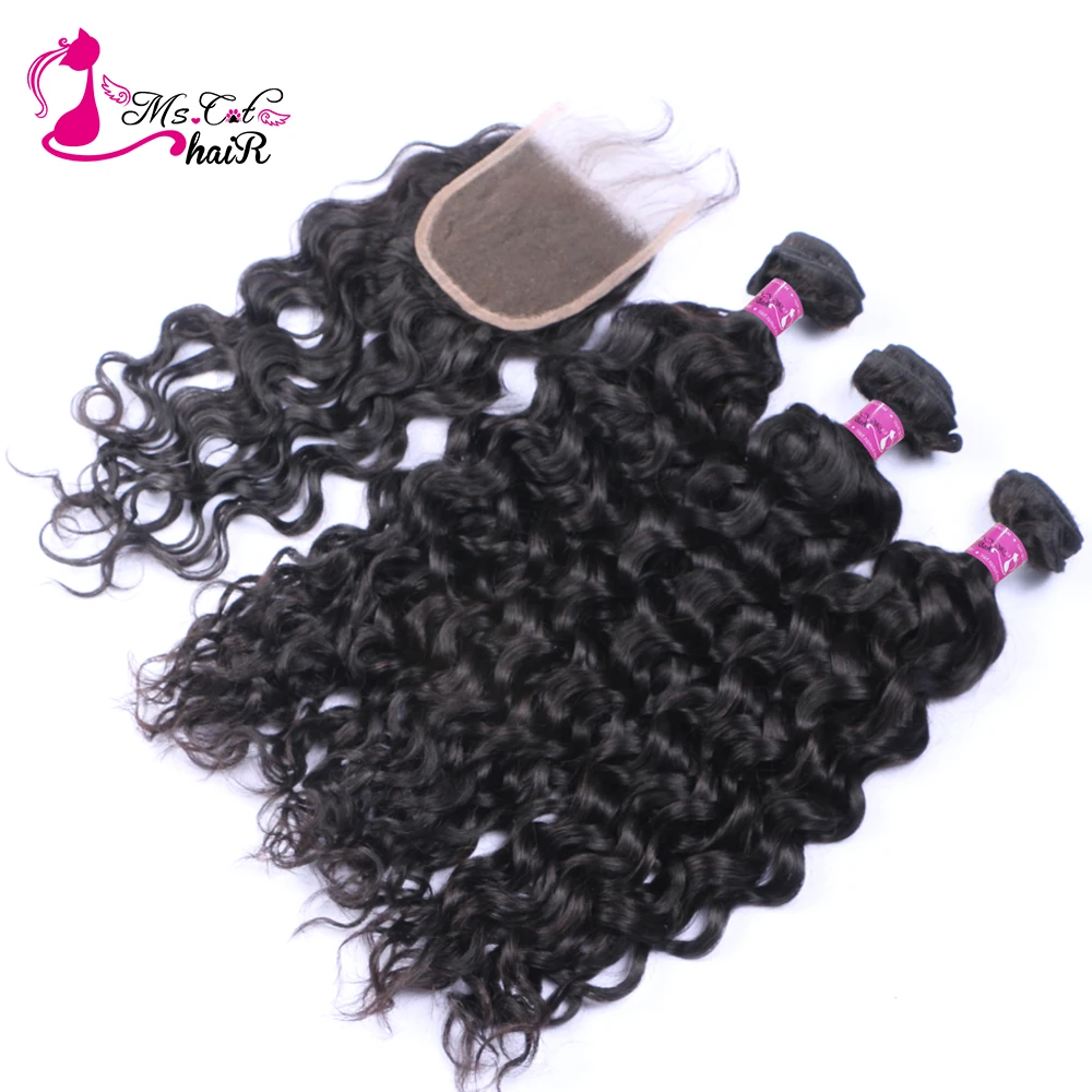 Ms Cat волосы 3 пучка бразильские волнистые человеческие волосы с 4x4 дюйма Кружева Закрытие отбеленные узлы Remy волосы переплетения 4 шт./лот