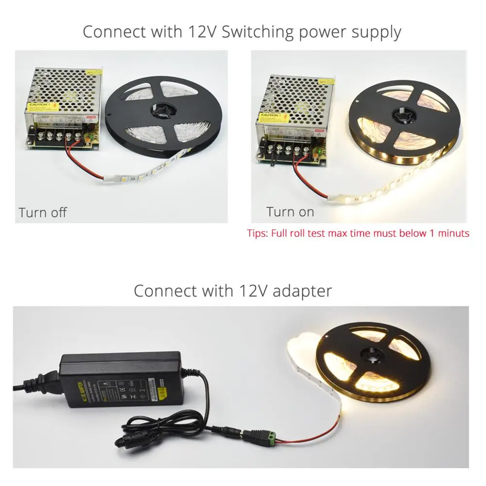 2. Это входное напряжение светодиодной ленты DC12V, пожалуйста, не подключайте свою основную мощность 110 В или 220 В, чтобы проверить его.