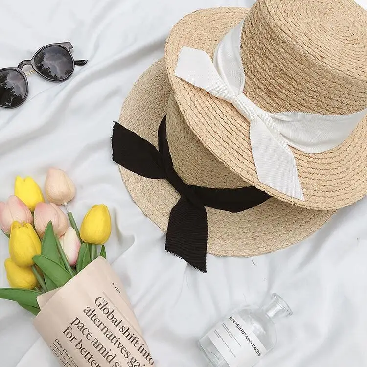 Шляпа женская из рафии, простая пляжная соломенная с бантом и лентой, с плоским верхом, с черной и белой лентой, для пляжа, летняя