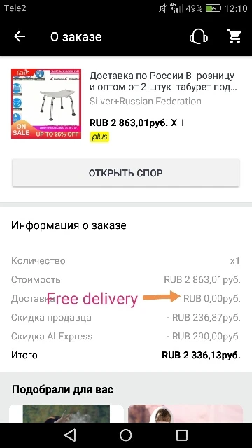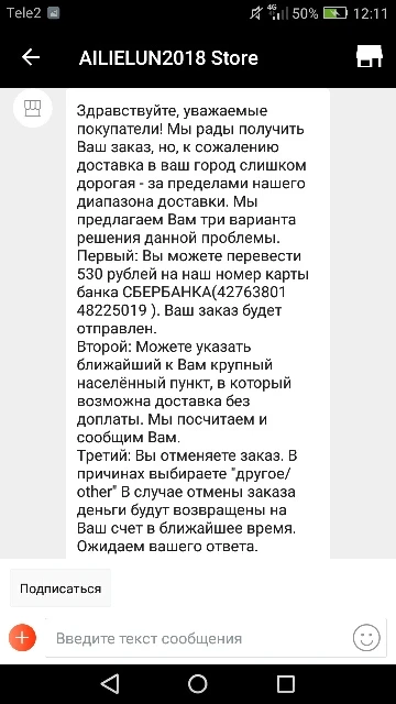 Выбрала бесплатную доставку из России в Россию и вот что получилось. Срок сборки заказа истёк, продавец выслал набор цифр вместо трек-кода и странное письмо. Доставка до вашего населённого пункта слишком дорогая, доплатите 530 рублей (ок.7$) или выберите ближайший бесплатный пункт доставки. Это большой недосмотр с их стороны: при бесплатной доставке я ничего не обязана платить, тем более через сторонний ресурс. Оплачиваю через Алиэкспресс и никаких доплат сверх того. Плюс все посылки из Китая могут дойти, а из родной страны почему-то нет. Договориться не удалось, открыла спор.