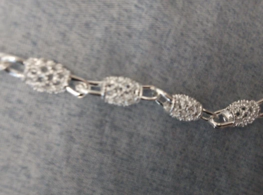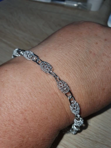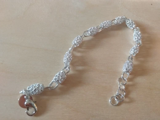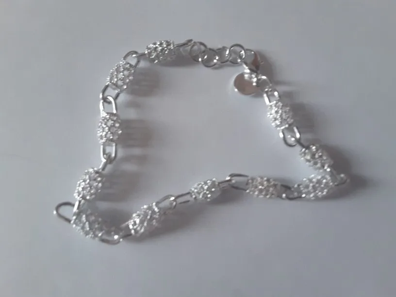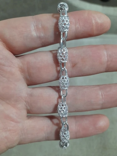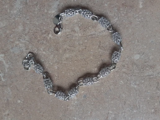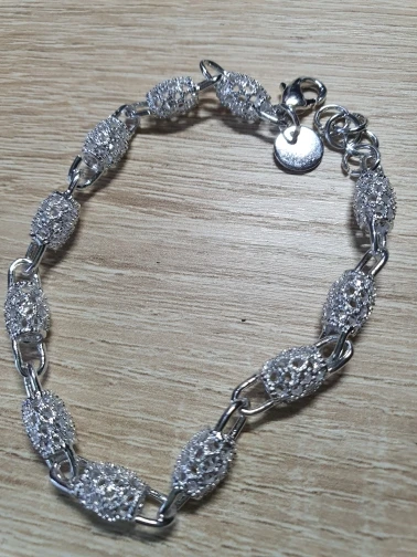 Браслет хороший, серебристый, но никаких кристаллов в нем нет, только узорный металл.