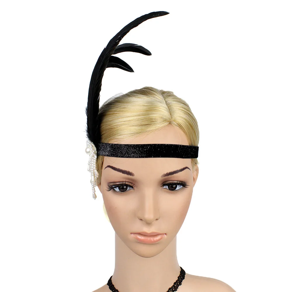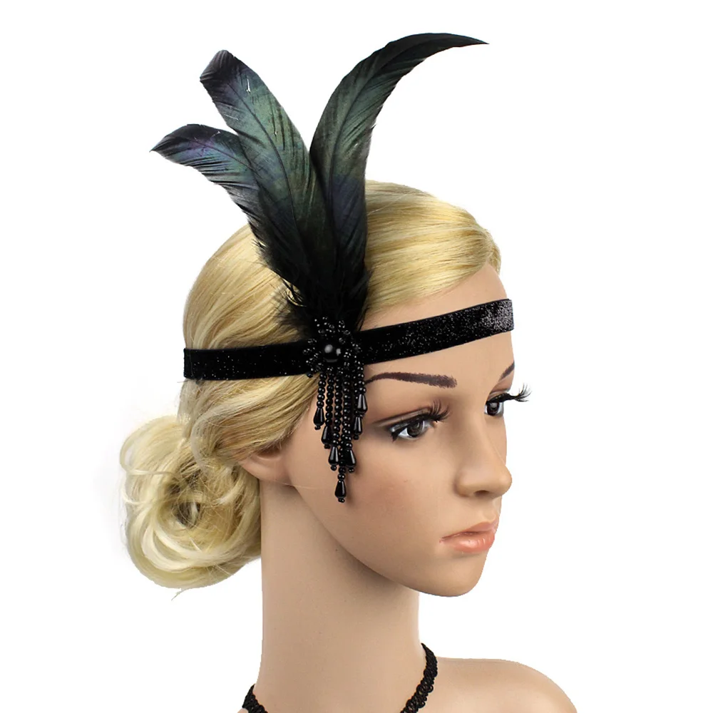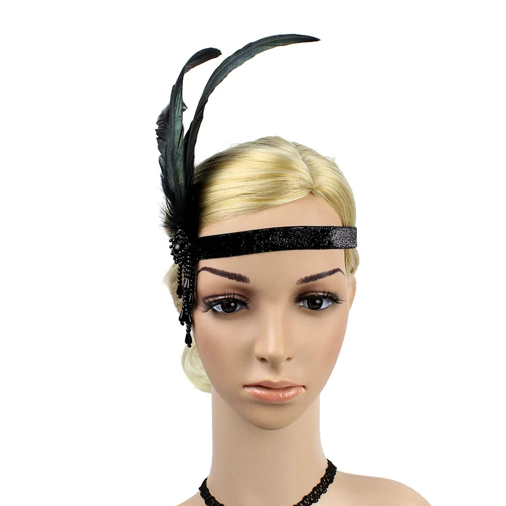 Женский ободок с черными перьями, винтажный ободок в стиле ретро с бусинами, большие Гетсби для волос, 1920-е