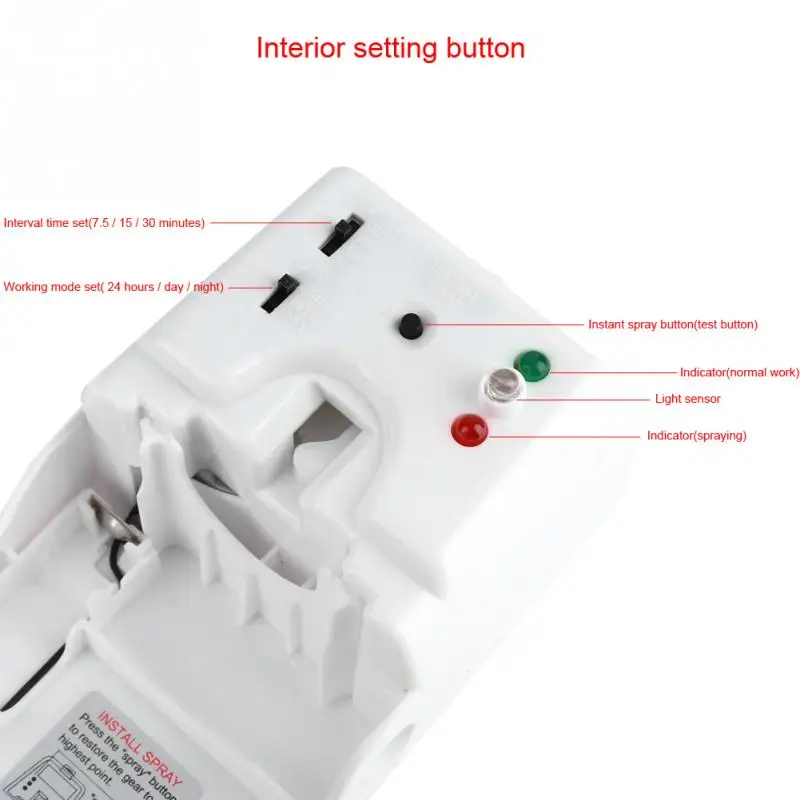 Характеристики: Состояние на 100% абсолютно новый Материал: АБС-пластик Цвет: белый Источник питания: 2 батарейки типа АА (не входят в комплект) Интервал времени: 7,5/15 / 30 минут (регулируемый) Режим работы: 24 часа/день/ночь Совместимый объем аэрозоля: 300 мл Совместимый размер аэрозоля (H x Diam.): прибл. 14x6,5 см/5,51 x 2.56in Размер: прибл. 19,5x8,5x8 см/7,68x3,35 x 3.15in Вес: прибл. 295 г Посылка включает в себя: 1 х автоматический аэрозольный диспенсер(Батарея и аэрозоль в комплект не входят) 1 комплект монтажных аксессуаров Примечание: 1. Пожалуйста, не смотрите на распыляющее сопло, особенно на глаза. 2. Как только аромат попадет в ваши глаза, промойте глаза большим количеством чистой воды около 15 минут.