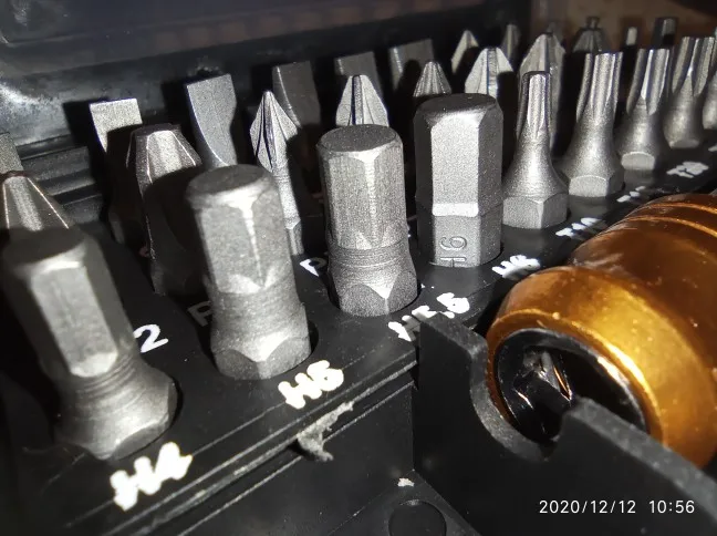 Адаптер для вставки различных наконечников, имеет отклонение от своей оси, что вызывает разъемы (колебание) инструментов, которые вставлены и затрудняет работу отвертки.