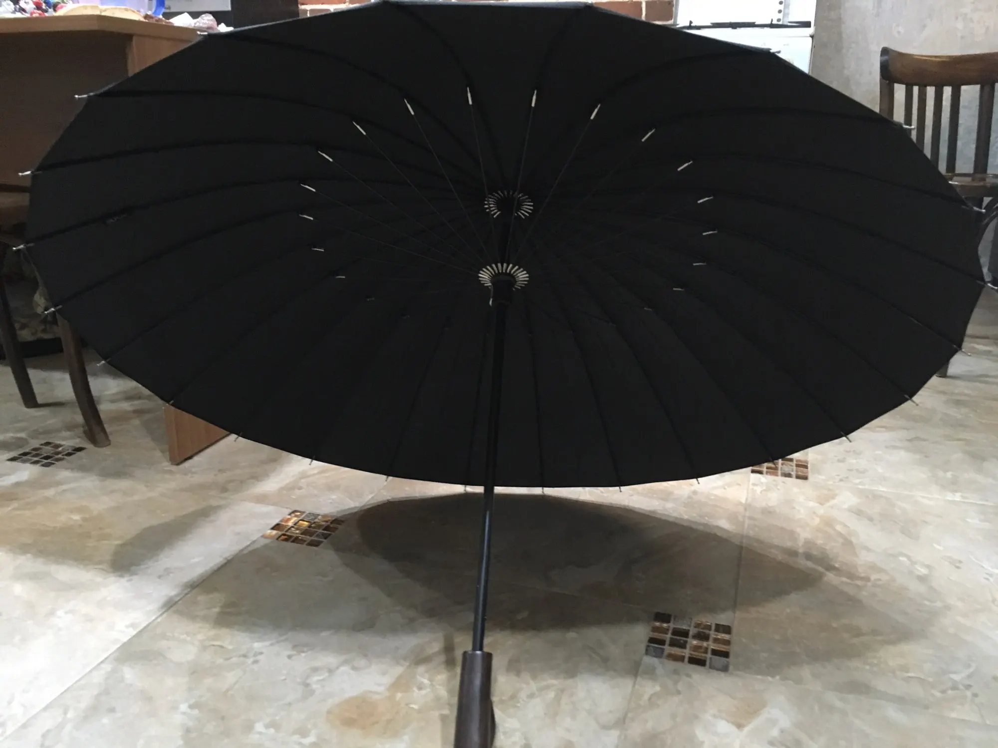 Выглядит крепко. Ощущается приятно в руке. Деревянная ручка. Частые спицы, устойчив к порывам ветра. Своих денег стоит