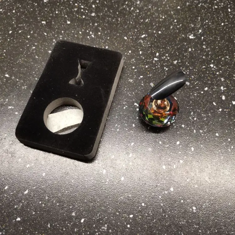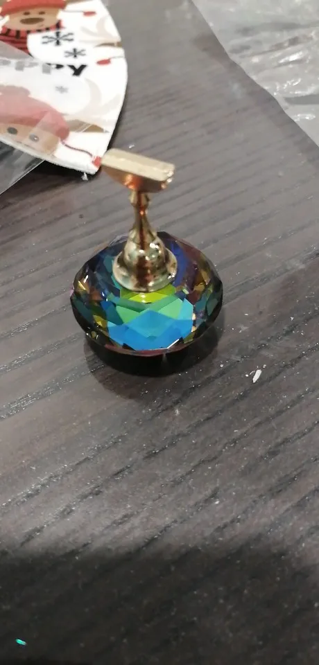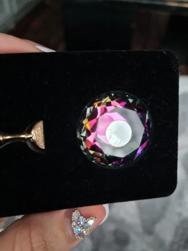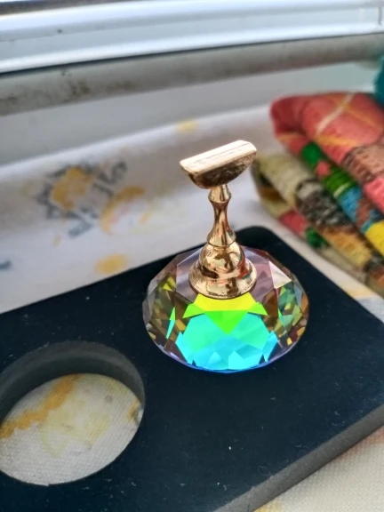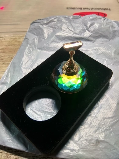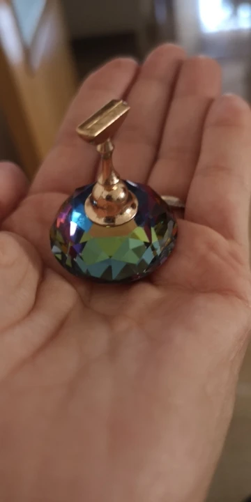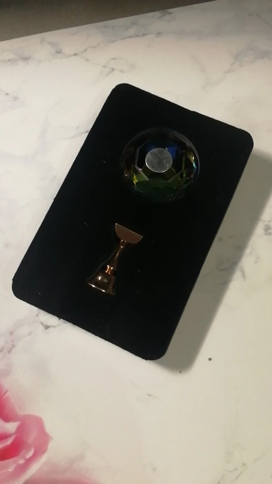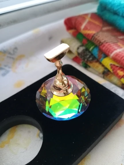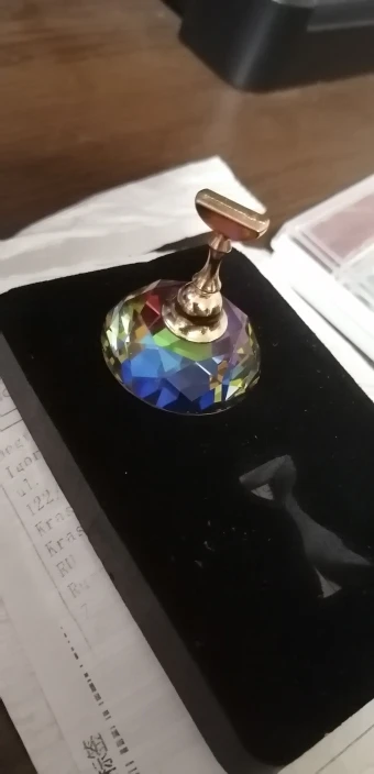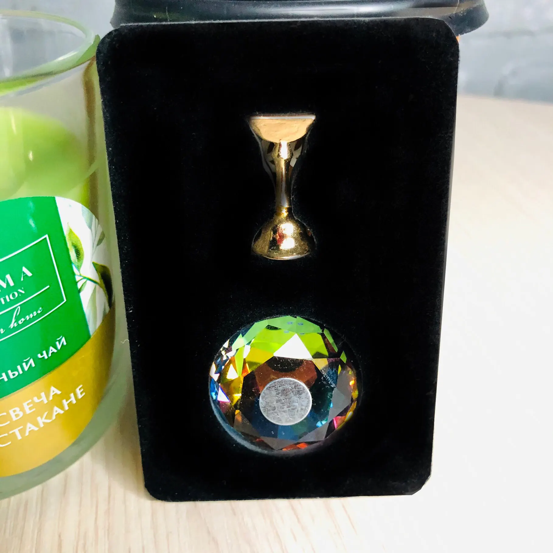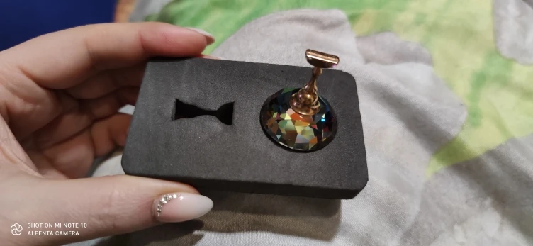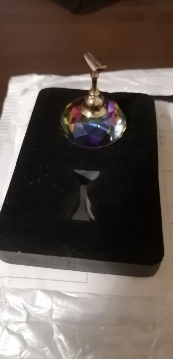Дошёл кристалл в целости без сколов, магнит мощный и хорошо держит верхнюю часть(подставку) работать удобно, для крепления типсы использую двухсторонний скотч и после работы легко очищается,в кадре для фото дизайнов кристалл смотрится эффектно, в комплекте 1 кристалл 1 подставка и чёрный поролоновый держатель(на первом фото) какой либо дополнительной коробке нет.