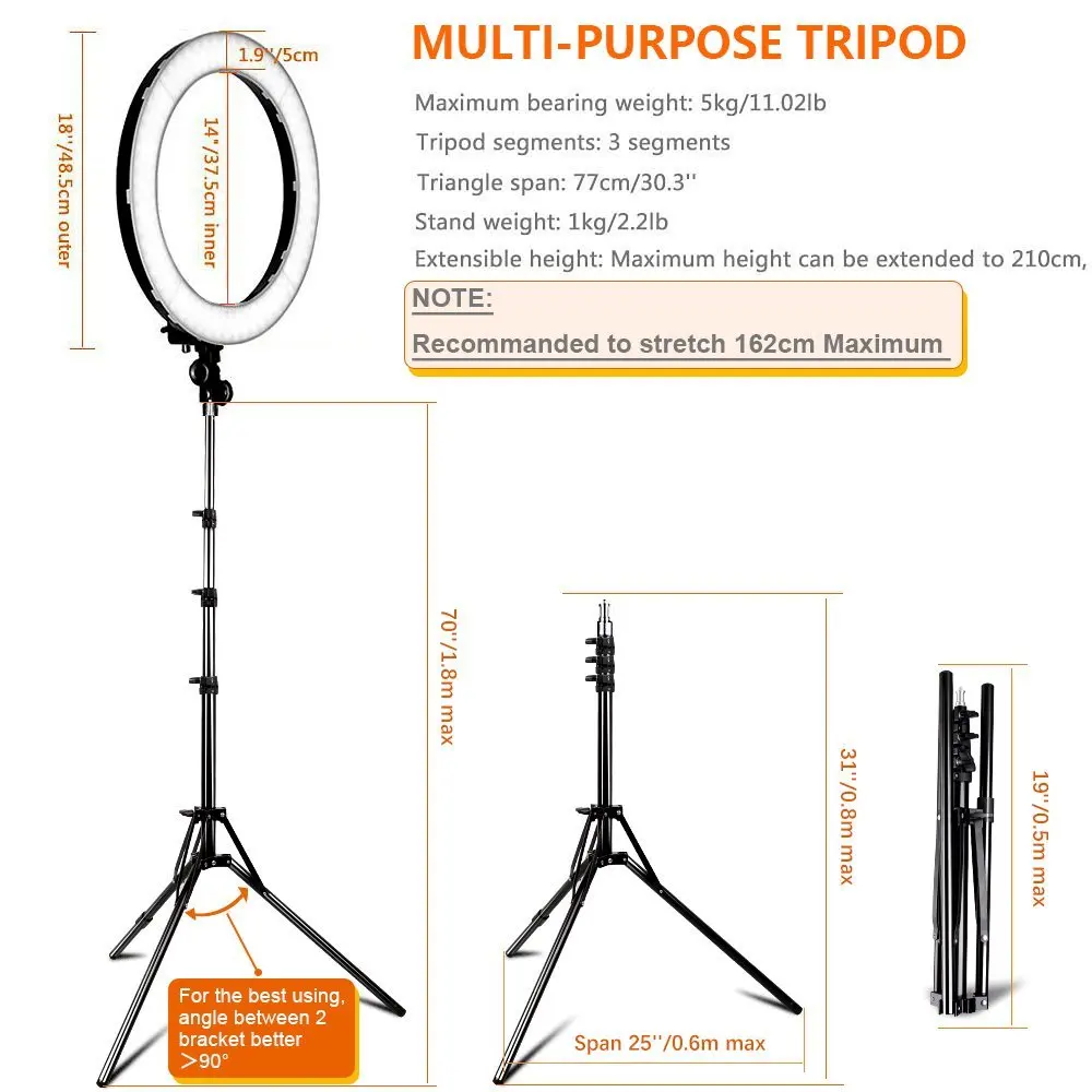 Особенности:Диммируемый 18-дюймовый светодиодный SMD кольцевой светильник с широким диапазоном затемнения от 10% до 100%.Специальная светодиодная SMD-конструкция, легкий и портативный. Привод постоянного тока, низкие потери мощности.Отсутствие ультрафиолетового и инфракрасного излучения, низкое тепловыделение, Безопасность и защита окружающей среды.Длительный срок службы более 50000 часов.С усиленной гибкой рукой, которая будет свободно двигаться и никогда не упадет.Удлиненный шнур и сверхпрочные винты с большим пальцем.С набором пластиковых цветных фильтров: оранжевый + белыйШироко применяется для наружного фотосветильник щения, заполнения светильник в помещении, портрета, моды, свадебного искусства, рекламной фотографии, съемки видео и т. д.Характеристики:Кольцевой светильник RL-18Источник светильник светодиодный SMDСветодиодные лампы: 240 шт.Форма: КольцоВнешний диаметр: 18 дюймов/48 смОбщая мощность: 55 ВтЦветовая температура: 5500 кДиммируемый: плавное затемнениеДиапазон затемнения: 10%-100%Общее освещение: лмCRI (индекс цветопередачи): >90Адаптер: УниверсальныйМощность: 55 ВтВход переменного тока: 110-240 В, 50/60 ГцПосылка: 4,9-5 кгСветильник вая подставка:Максимальная высота: 185 смМинимальная высота: 48 смСегменты: 4Материал: алюминийДержатель телефона:Максимальная ширина: 8,5 смМинимальная ширина: 5,5 см
