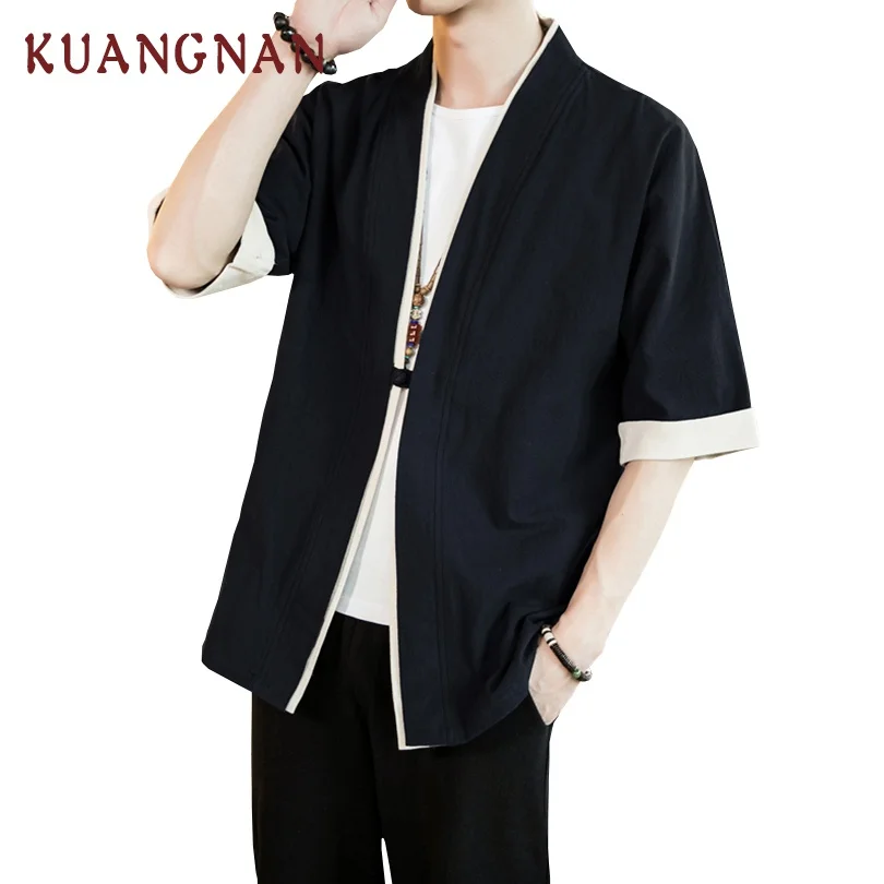 Мужская рубашка в китайском стиле KUANGNAN, однотонная Повседневная хлопковая уличная рубашка с рукавом до локтя, кимоно, Мужская одежда, новинка 2019
