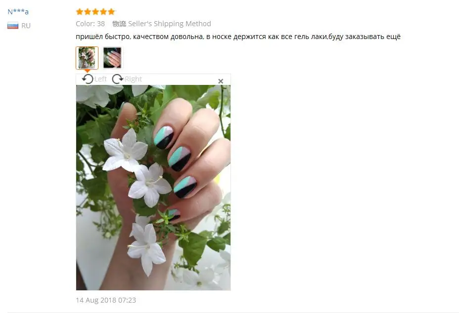 Цвет очень красивый. Вы должны увидеть сейчас, когда вы используете его, как это выглядит на ногтях. Продавцу потребовалось около двух месяцев, чтобы отправить заказ.