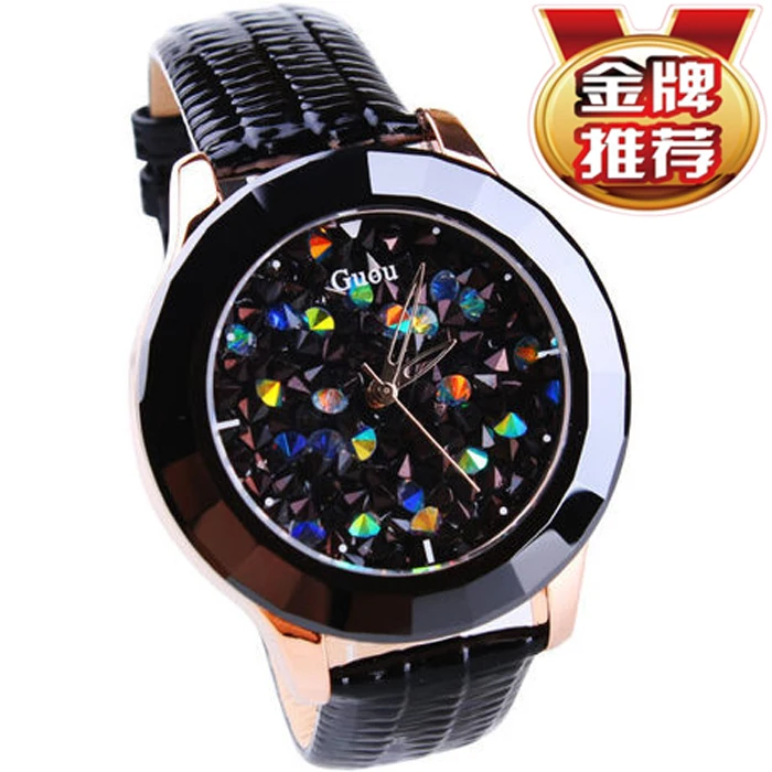 Роскошные Guou бренд ремень из натуральной кожи женские часы с цельными круглыми кристаллами часы представительского класса дамские полная Алмазная Стразы кварцевые часы с логотипом