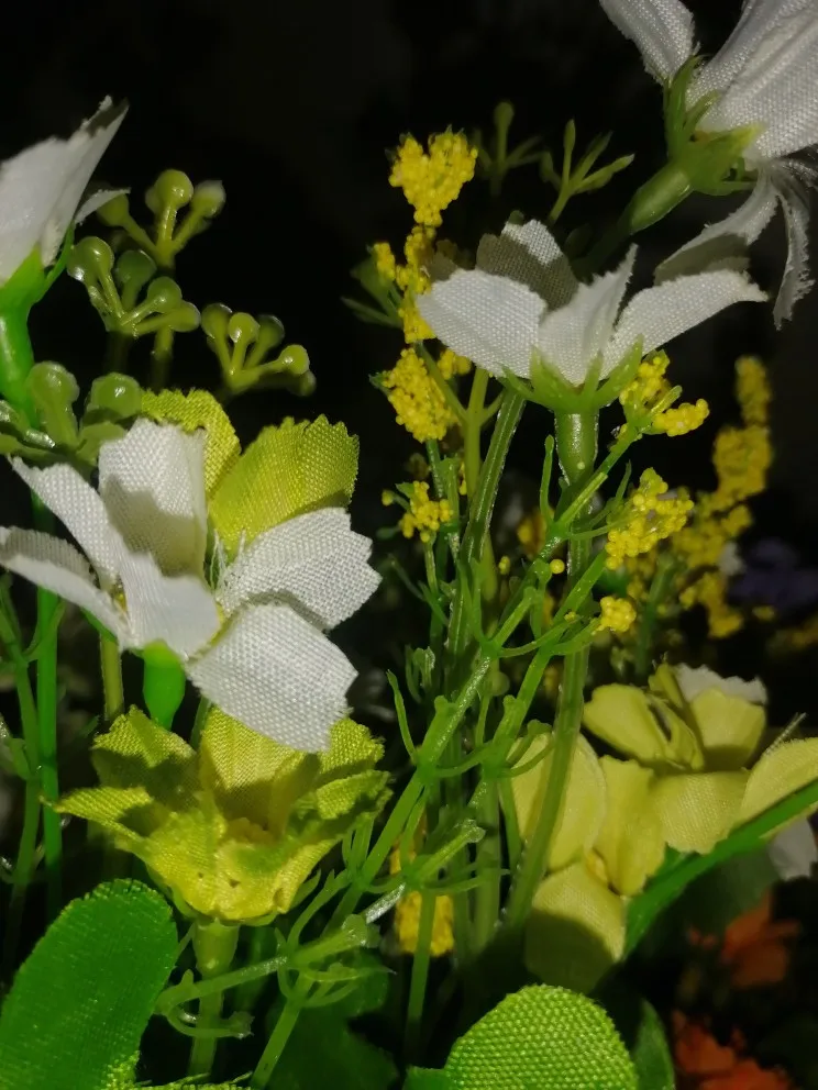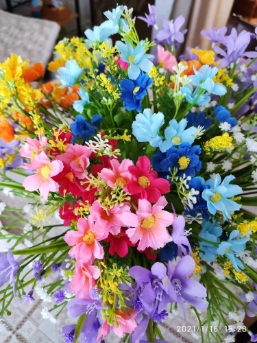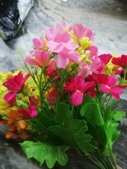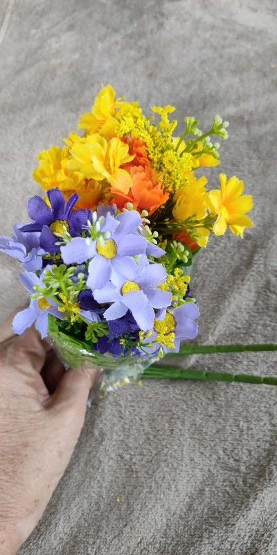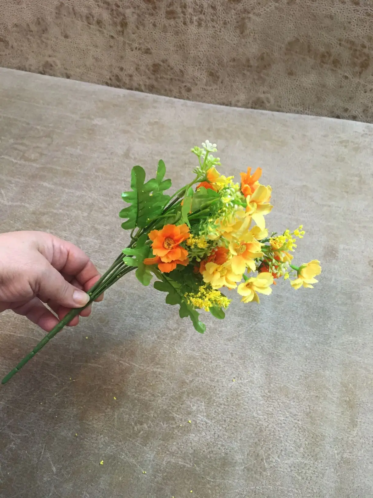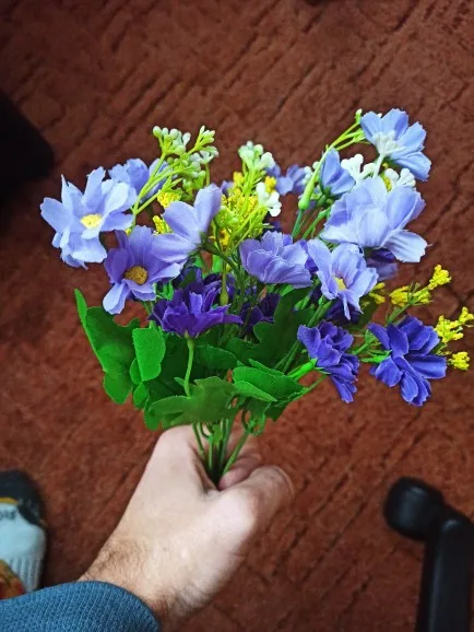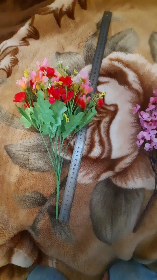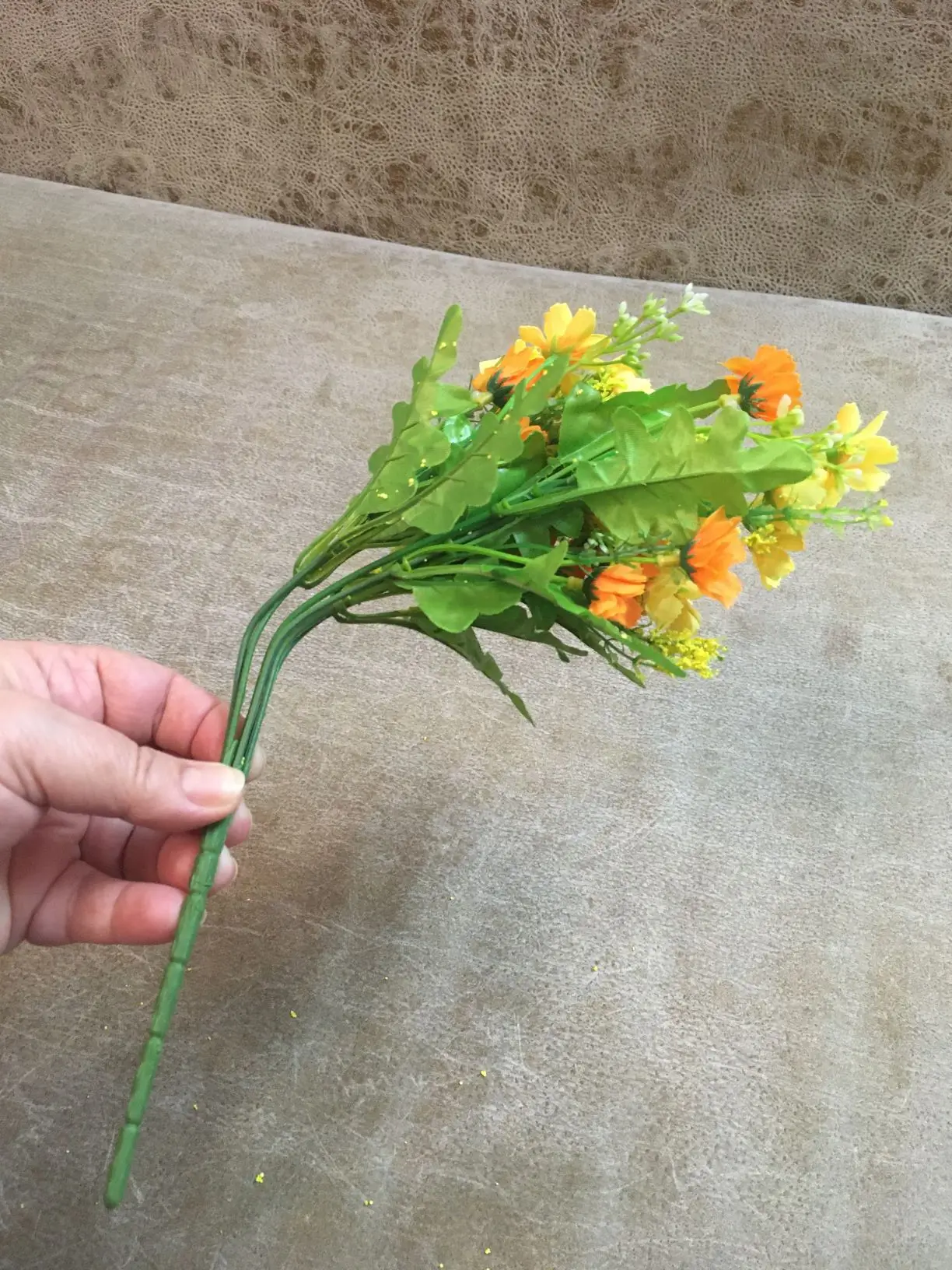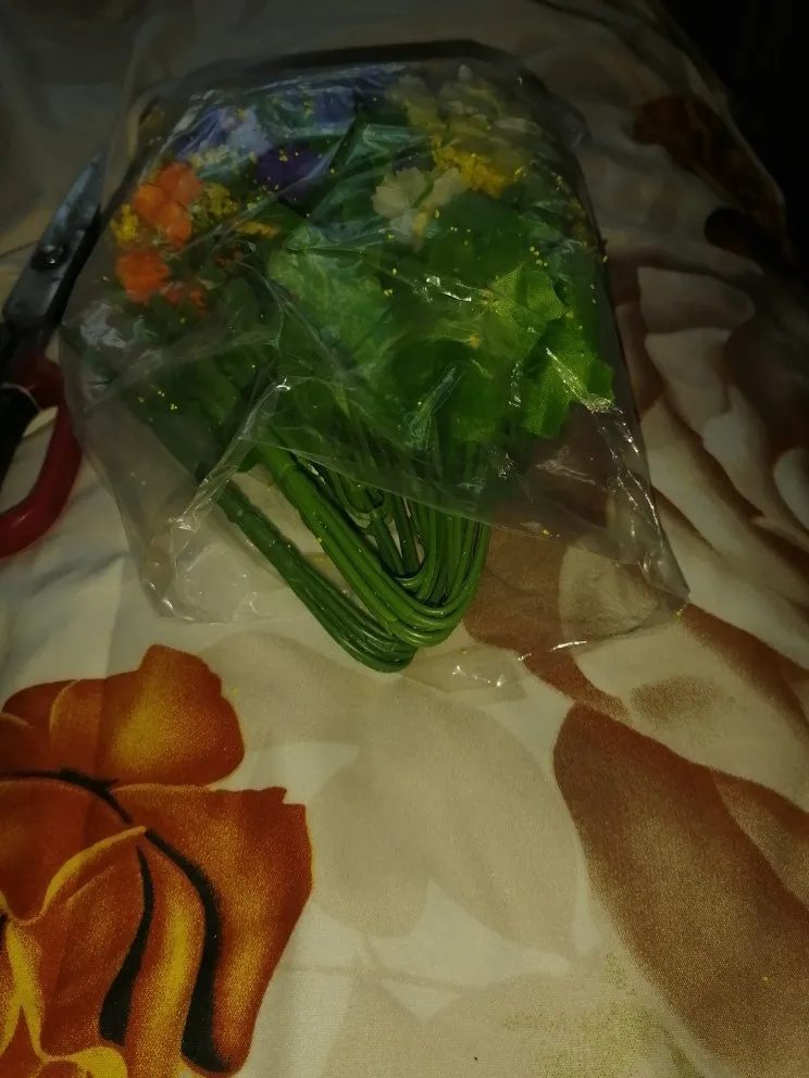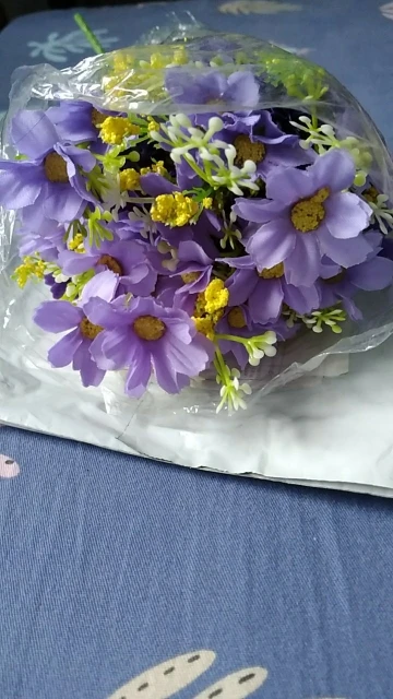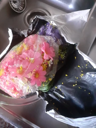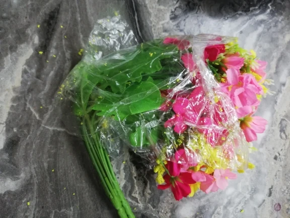 Когда открыла пакет(посылку), то увидела желтое порошкообразное вещество. Его было очень много. Это оказались оторвавшиеся(осыпавшиеся) желтые пупырки с цветов. Заказала разных цветов букетики. Эти пупырки отпали от всех цветочков. А так претензий нет, красиво ,если расправить букетики.