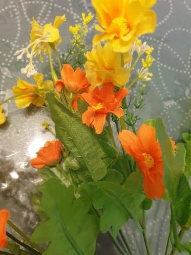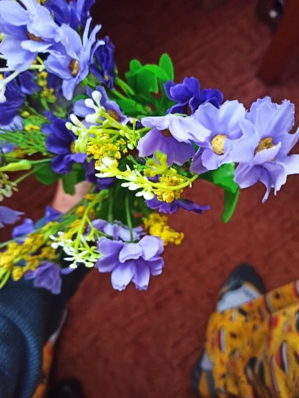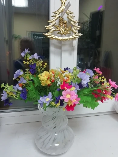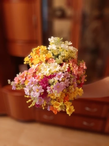 Букет красивый, нежные мелкие цветочки не перегружают и издалека кажутся вполне естественными. Желтое напыление на декоре в виде веточек обсыпается очень сильно. в остальном, ни один цветок не оторвался, все выполнено аккуратно.