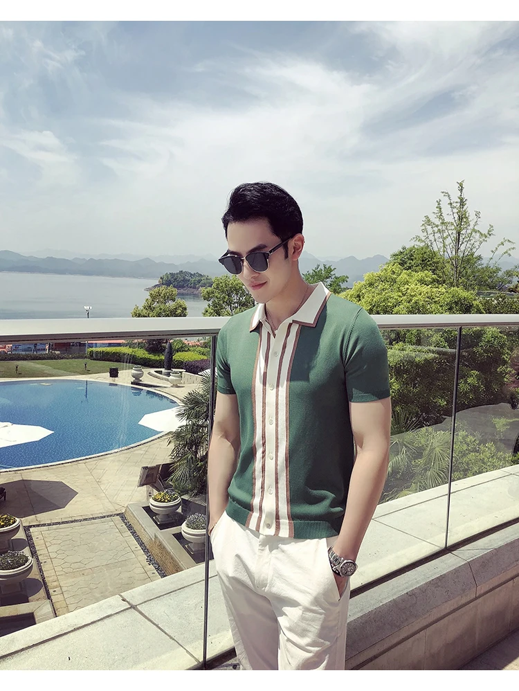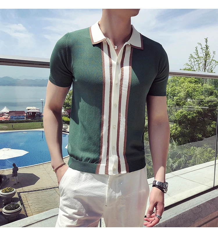 Контрастная трикотажная полосатая рубашка поло в британском стиле, Мужская модная рубашка поло с коротким рукавом, Camisa Masculina Polo Playera рубашка поло Hombre черного и зеленого цвета