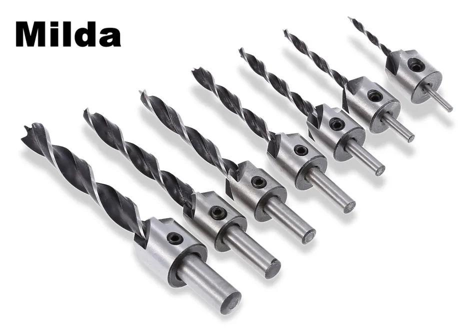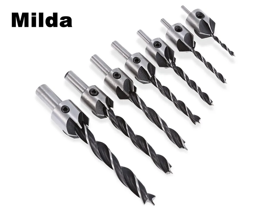 Набор сверл Milda, комплект из 3 быстрорежущих зенкеров с фасками, 7 шт, для деревообработки