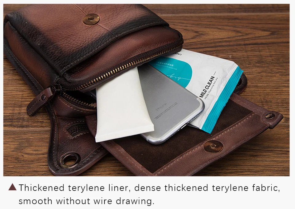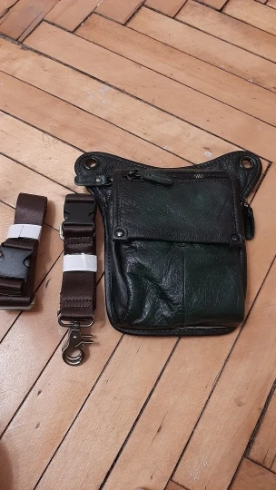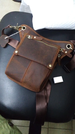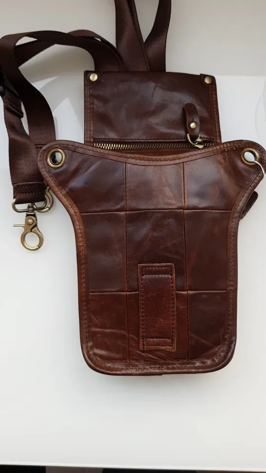 12 дней от заказа до получения в Московской области! Сумка жесткая (углы кармашка не будут загибаться), остаются следы, ели провести ногтем (dark brown 1). Размеры основного отделения 170 х 140 мм, верхнее отделение почему-то меньше, телефон 6,67" (высота 165 мм) влезает только если снять чехол. В основное отделение помещается с чехлом, но впритык. На фото - какой-то карлик, пристегивая к ноге, ножной ремень не горизонтален, а уходит вниз.