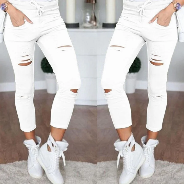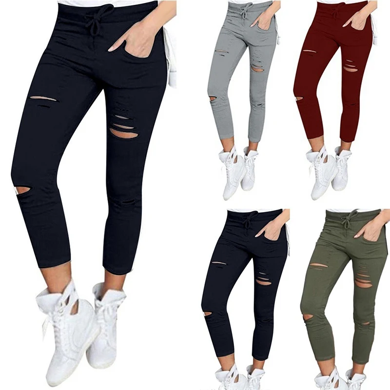 Леггинсы женские с дырками, модные тонкие брюки-карандаш до щиколотки, повседневные Однотонные эластичные облегающие брюки, размера плюс 4XL, на лето