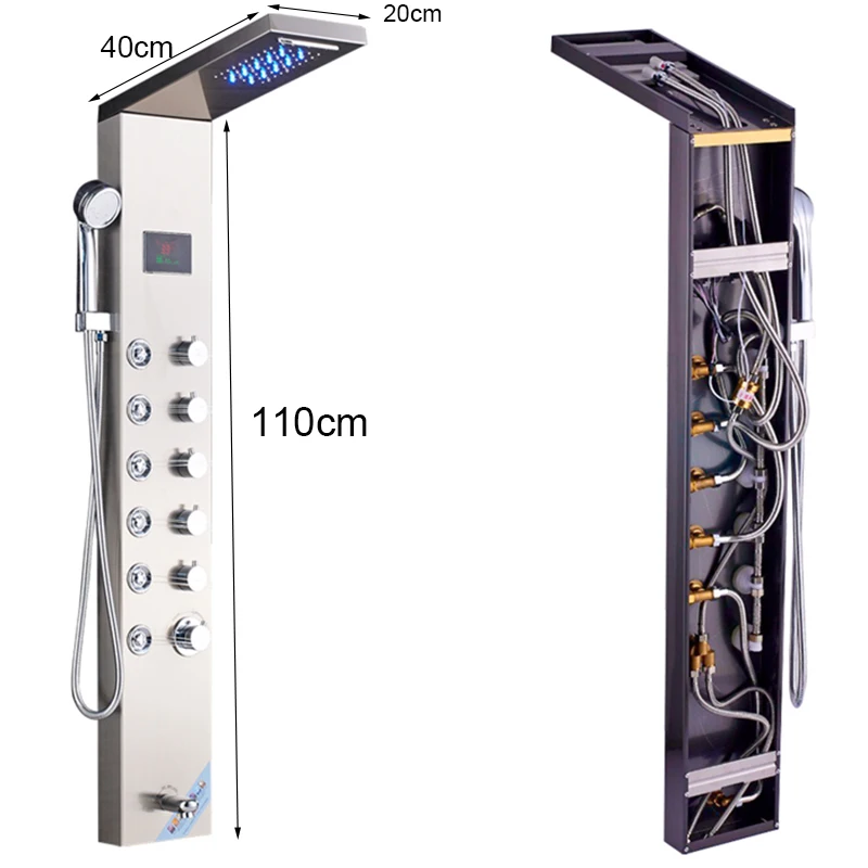 Функция: смесители для душа Характеристики: настенное крепление Стиль: Современный Тип клапана: Керамический клапан Материал корпуса смесителя: нержавеющая сталь Материал ручного душа: АБС-пластик (хромированная отделка) Шланг для душа: хромированный материал из нержавеющей стали 150 см Насадка для душа имеет только синий свет, цвет не может изменяться при температуре воды Как только вы откроете воду, синий свет будет работать, только когда вы закроете воду, тогда синий свет будет работать. Светодиодная лампа, работающая от потока воды, не требует батареи или вилки 6 ручек/ручек для различных функций, это не термостатический клапан смесителя. Цифровой температурный дисплей: работает через поток потока, не нужен аккумулятор или вилкаСветодиодная душевая панель из нержавеющей стали, настенная душевая колонка, система температуры, цифровой экран, вращающийся распылитель для массажа струй