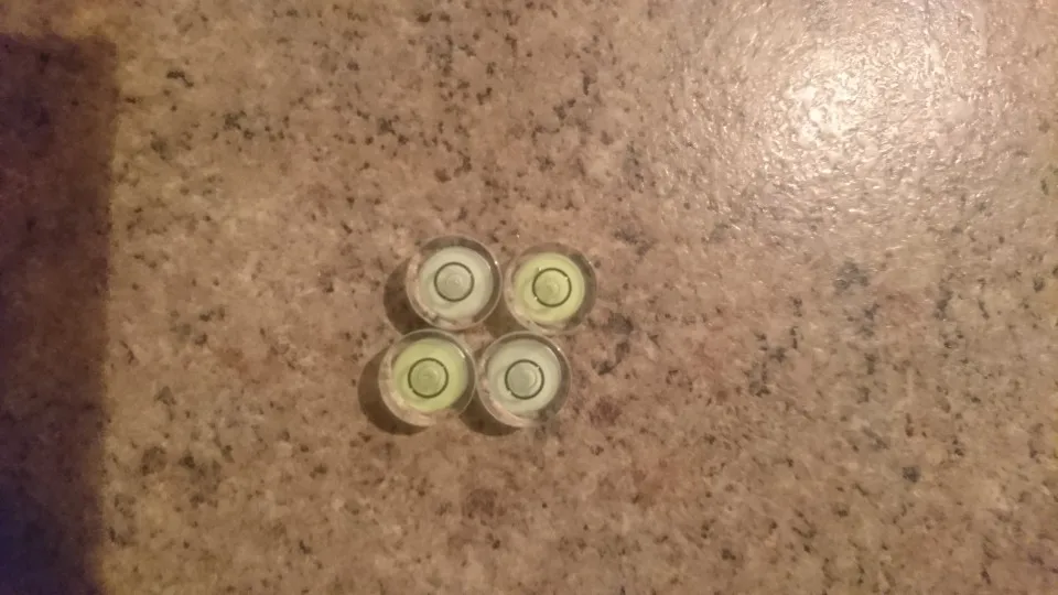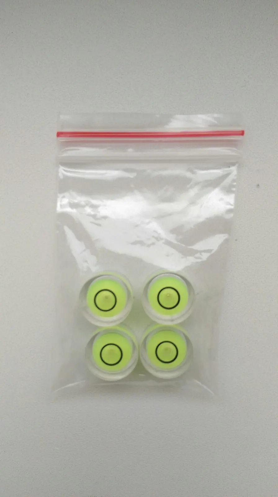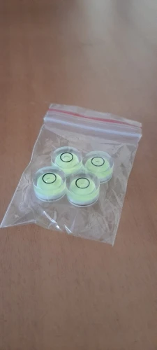 На горизонтальной поверхности у всех четырёх образцов воздушный пузырёк не выходит за границы чёрной окружности, что в принципе уже хорошо для такого мелкого дивайса. На вид товар выглядит качественно, хотя у одного из моих экземпляров (на фото справа внизу) центральный шарик вывалился из лунки и болтается внутри, возможно это произошло от тряски при транспортировке... Но остальные-то три вполне кондиционные... Подозреваю, что поэтому их и продают не по одному...