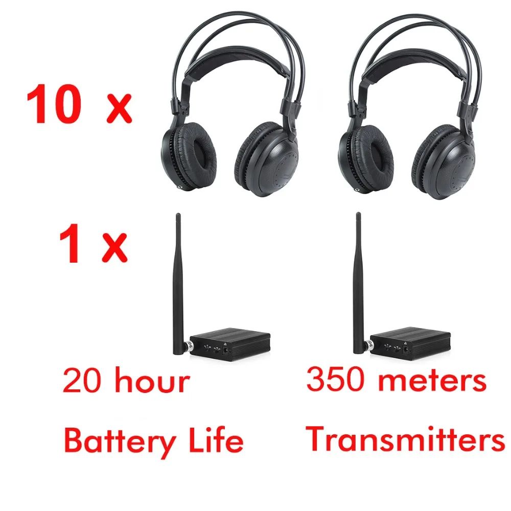 10 беспроводных диско-наушников UHF-61 x 350mtr передатчик2xaudio кабели (1xrca/1x3,5 мм)1 сетевой адаптер (Великобритания/евро/США/Oz)Все, что вам нужно, это наше здесь!