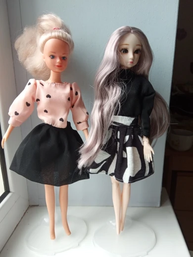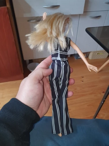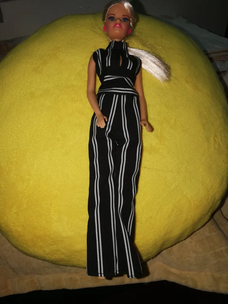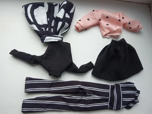 Покупался костюм для куклы типа Barbie. Однако комбинезон оказался большим. Для примера ручка показывает конец торса куклы, а под ручкой лишняя ткань, то есть торс куклы в длину меньше, чем боди от комбинезона. Это расстроило, поэтому буду перешивать. А так качество хорошее.