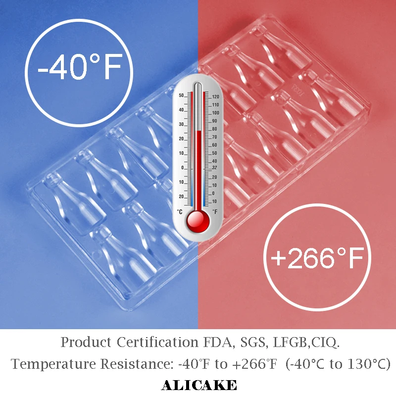 # Безопасная температура от-40 °F до + 266 °F (от-40 ℃ до + 130 ℃).# Форму нельзя использовать в духовке и микроволновой печи.# Холодильник и морозильник безопасны.Примечание1. Форму следует постирать перед первым использованием2. Не используйте в Газе и огне.3. Не используйте ножи или другие острые толчки на силиконовых формочках и избегайте стресса.