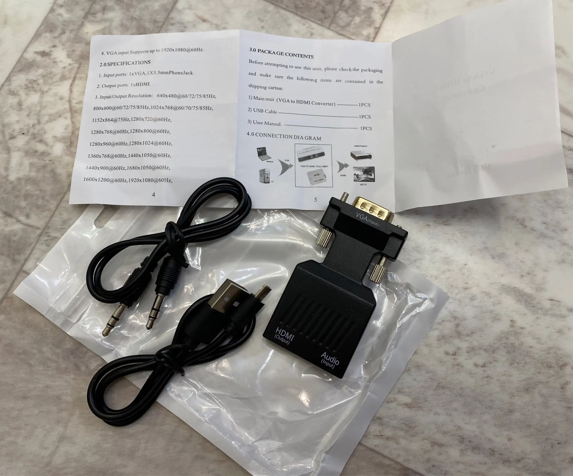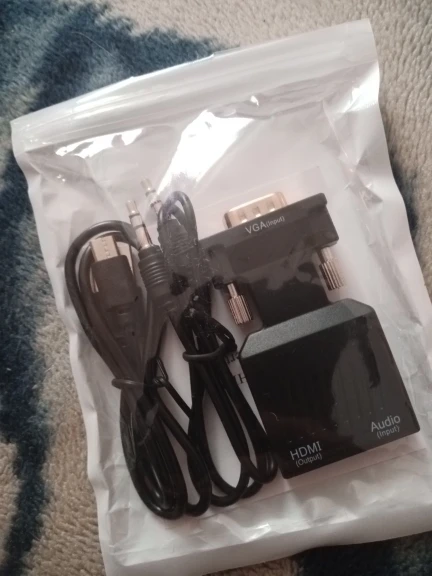 Работает чётко. Питание взял в USB 2.0. При включении, есть небольшая бегущая "ёлочка", справа верхний угол в лево вниз. После загрузки рабочего стола "ёлочка" пропадает. Добавилось ещ1 одно разрешение к 1600 на 1200. Добавилось 1920 на 1440. Монитор Philips 22 дюйма стал ругаться, что не поддерживает такое разрешение пришлось снизить до 1600 на 1200. 1920на1080 не появилось. Как поставить FHD не знаю. Звук передаёт. Звуковой и питающий кабели в комплекте!!! Полностью рабочая приблуда. Если надо VGA запихать в HDMI рекомендую к покупке.