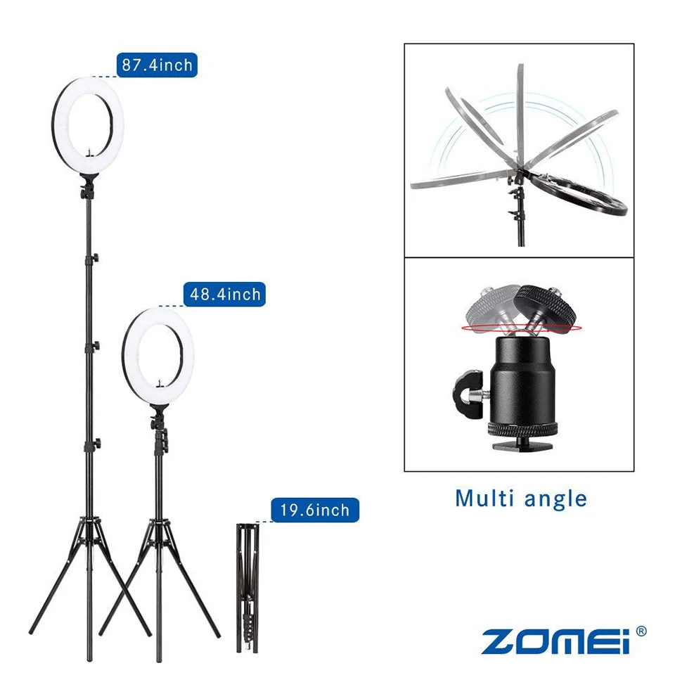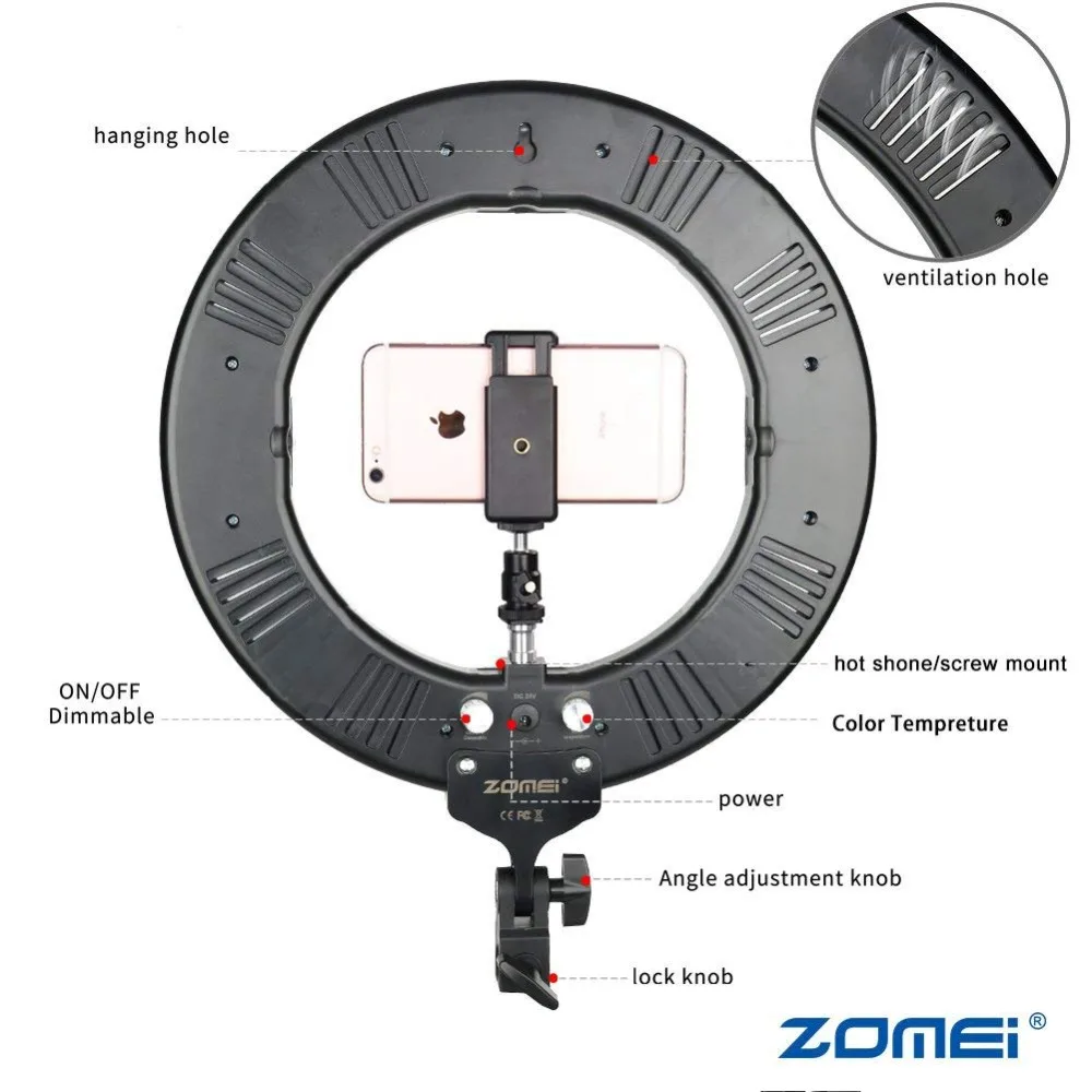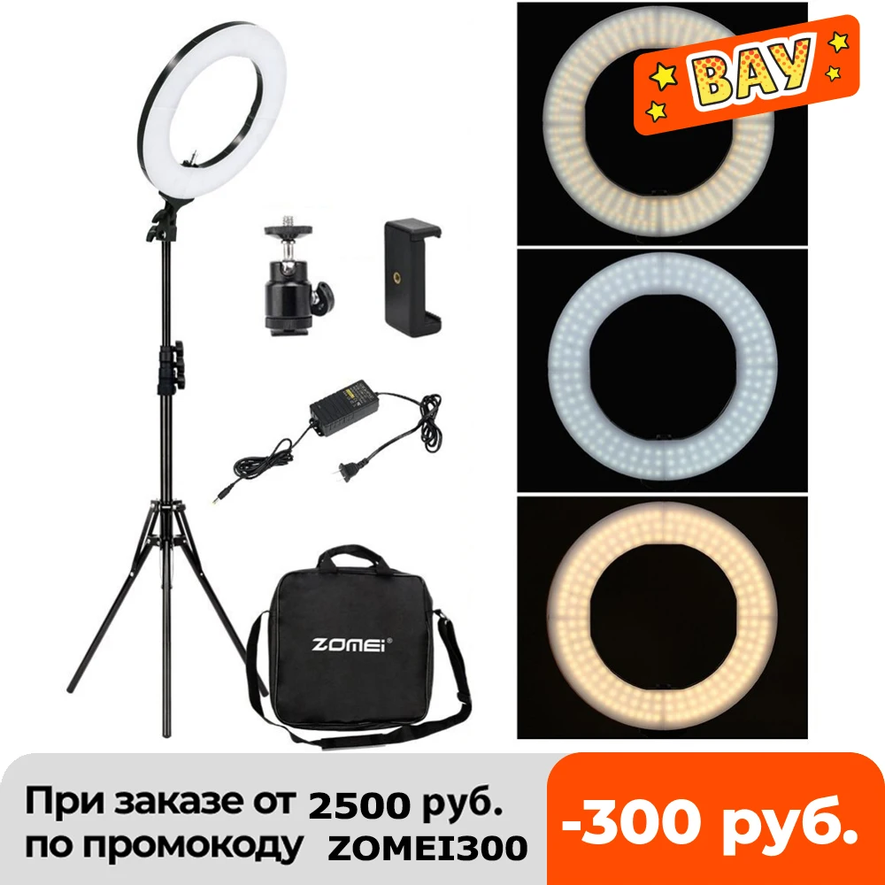 Кольцевой светильник Zomei с регулируемой яркостью для фотостудии, 3200-5600K, светодиодный светильник, адаптер для телефона, для нанесения макияжа, для прямой трансляции видео